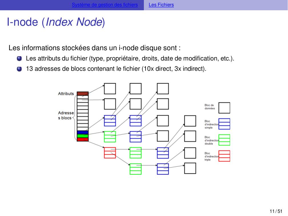 Page 11 : Système de gestion des fichiersLes FichiersI-node Index NodeLes informations stockées dans un i-node disque sont :Les attributs du fichier type, propriétaire, droits, date de modification, etc.. 13 adresses de blocs contenant le fichier 10x direct, 3x indirect.11/ 51