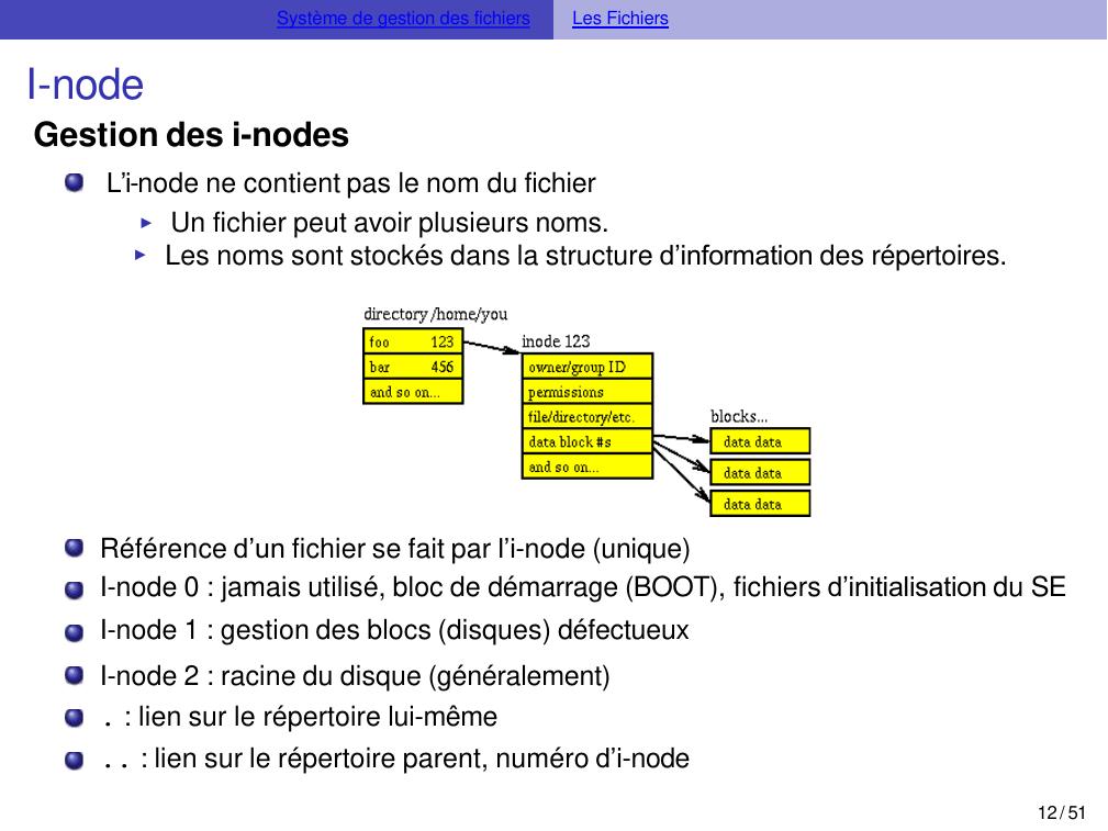 Page 12 : Système de gestion des fichiersLes FichiersI-nodeGestion des i-nodesL’i-node ne contient pas le nom du fichier▶Un fichier peut avoir plusieurs noms.▶Les noms sont stockés dans la structure d’information des répertoires.Référence d’un fichier se fait par l’i-node uniqueI-node 0 : jamais utilisé, bloc de démarrage BOOT, fichiers d’initialisation du SE I-node 1 : gestion des blocs disques défectueuxI-node 2 : racine du disque généralement. : lien sur le répertoire lui-même.. : lien sur le répertoire parent, numéro d’i-node12/ 51