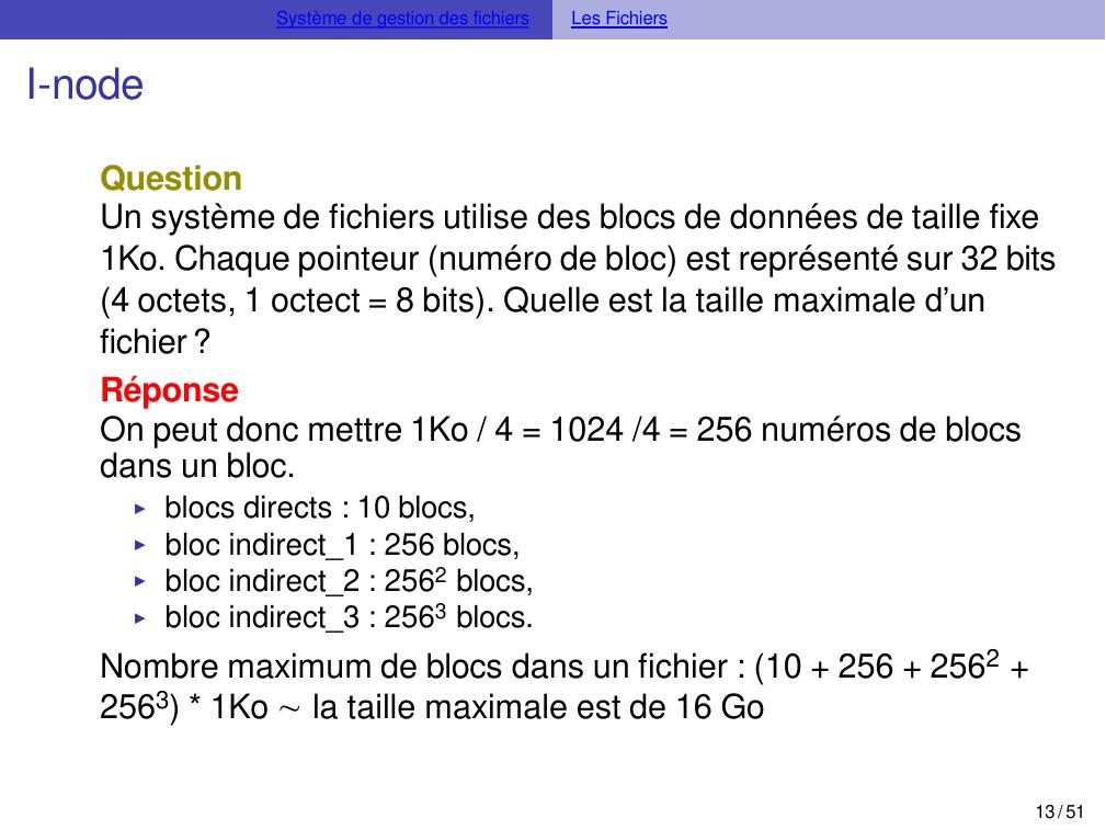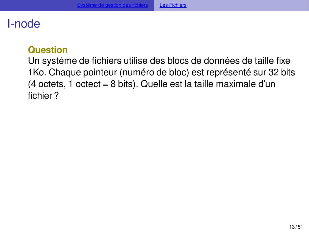 Page 13 : Système de gestion des fichiersLes Fichiers13/ 51I-nodeQuestionUn système de fichiers utilise des blocs de données de taille fixe 1Ko. Chaque pointeur numéro de bloc est représenté sur 32 bits 4 octets, 1 octect = 8 bits. Quelle est la taille maximale d’un fichier ?