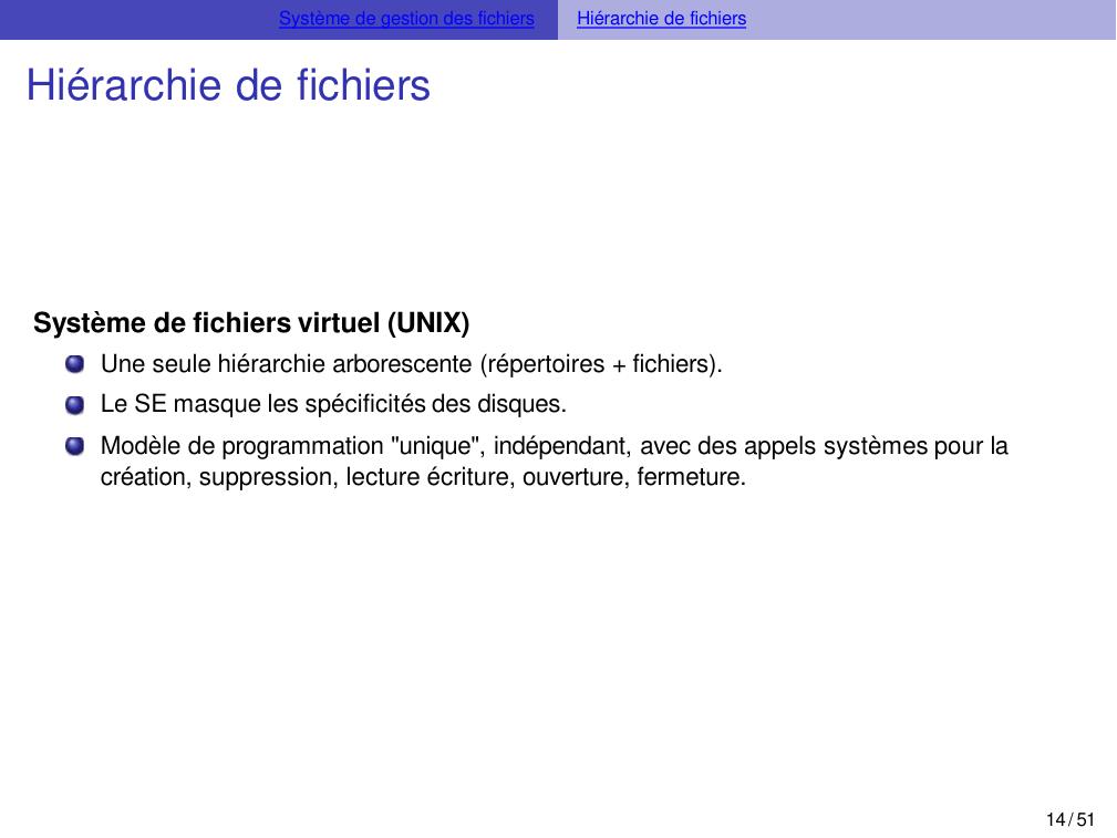 Page 15 : Système de gestion des fichiersHiérarchie de fichiersHiérarchie de fichiersSystème de fichiers virtuel UNIXUne seule hiérarchie arborescente répertoires + fichiers. Le SE masque les spécificités des disques.Modèle de programmation "unique", indépendant, avec des appels systèmes pour lacréation, suppression, lecture écriture, ouverture, fermeture.14/ 51