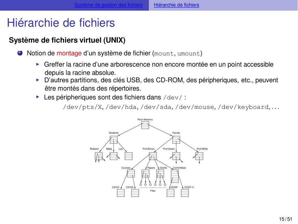 Page 16 : Système de gestion des fichiersHiérarchie de fichiersHiérarchie de fichiersSystème de fichiers virtuel UNIXNotion de montage d’un système de fichier mount, umount▶Greffer la racine d’une arborescence non encore montée en un point accessible depuis la racine absolue.▶D’autres partitions, des clés USB, des CD-ROM, des péripheriques, etc., peuventêtre montés dans des répertoires.▶Les péripheriques sont des fichiers dans /dev/ :/dev/pts/X, /dev/hda, /dev/sda, /dev/mouse, /dev/keyboard, . . .15/ 51