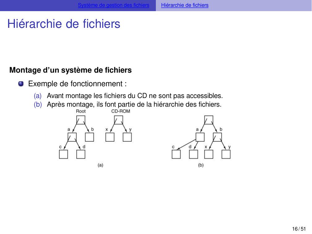 Page 17 : Système de gestion des fichiersHiérarchie de fichiersHiérarchie de fichiersMontage d’un système de fichiersExemple de fonctionnement :a Avant montage les fichiers du CD ne sont pas accessibles.b Après montage, ils font partie de la hiérarchie des fichiers.16/ 51