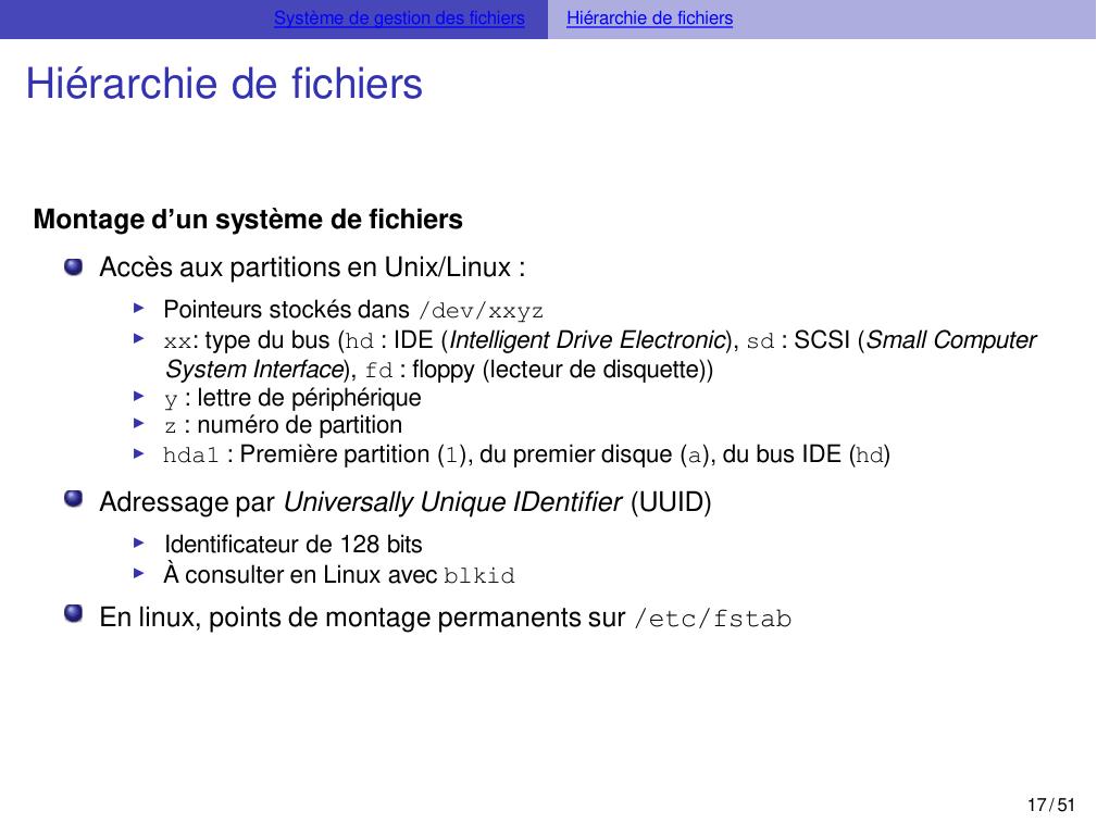 Page 18 : Système de gestion des fichiersHiérarchie de fichiersHiérarchie de fichiersMontage d’un système de fichiersAccès aux partitions en Unix/Linux :▶Pointeurs stockés dans /dev/xxyz▶xx: type du bus hd : IDE Intelligent Drive Electronic, sd : SCSI Small Computer System Interface, fd : floppy lecteur de disquette▶y : lettre de périphérique▶z : numéro de partition▶hda1 : Première partition 1, du premier disque a, du bus IDE hdAdressage par Universally Unique IDentifier UUID▶Identificateur de 128 bits▶À consulter en Linux avec blkidEn linux, points de montage permanents sur /etc/fstab17/ 51