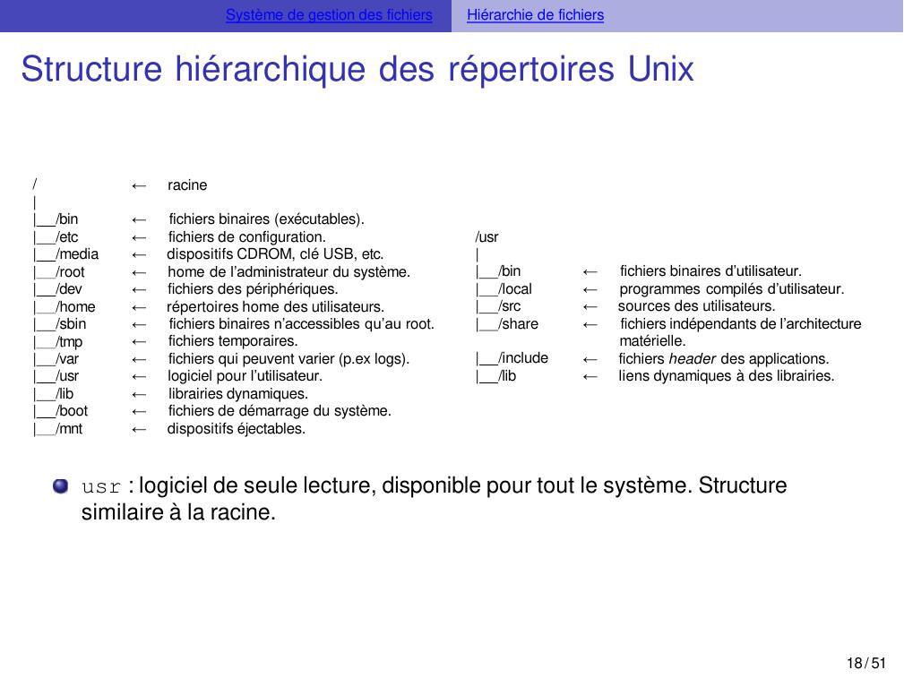 Page 19 : Système de gestion des fichiersHiérarchie de fichiersStructure hiérarchique des répertoires Unix//bin/etc/media/root/dev/home/sbin/tmp/var/usr/lib/boot/mnt←racine←fichiers binaires exécutables.←fichiers de configuration.←dispositifs CDROM, clé USB, etc.←home de l’administrateur du système.←fichiers des périphériques.←répertoires home des utilisateurs.←fichiers binaires n’accessibles qu’au root.←fichiers temporaires.←fichiers qui peuvent varier p.ex logs.←logiciel pour l’utilisateur.←librairies dynamiques.←fichiers de démarrage du système.←dispositifs éjectables./usr/bin/local/src/share←fichiers binaires d’utilisateur.←programmes compilés d’utilisateur.←sources des utilisateurs.←fichiers indépendants de l’architecturematérielle.←fichiers header des applications.←liens dynamiques à des librairies./include/libusr : logiciel de seule lecture, disponible pour tout le système. Structure similaire à la racine.18/ 51