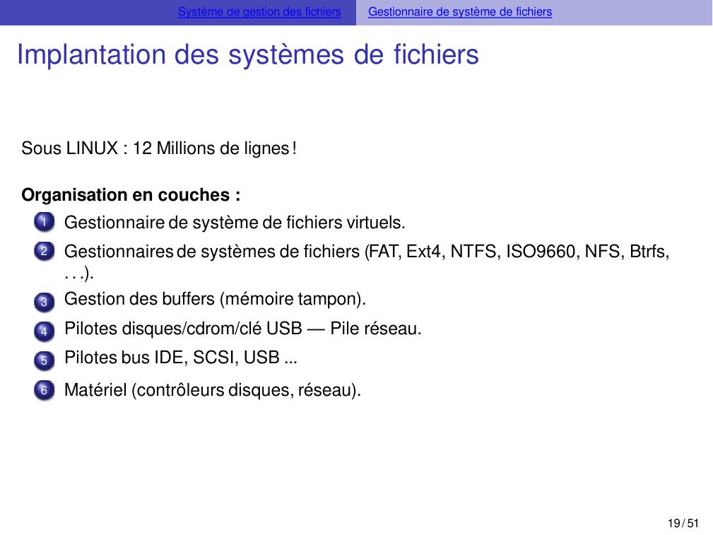 Page 20 : Système de gestion des fichiersGestionnaire de système de fichiersImplantation des systèmes de fichiersSous LINUX : 12 Millions de lignes!Organisation en couches :1Gestionnaire de système de fichiers virtuels.Gestionnairesde systèmes de fichiers FAT, Ext4, NTFS, ISO9660, NFS, Btrfs,. . ..Gestion des buffers mémoire tampon.Pilotes disques/cdrom/clé USB — Pile réseau. Pilotes bus IDE, SCSI, USB ...Matériel contrôleurs disques, réseau.2345619/ 51