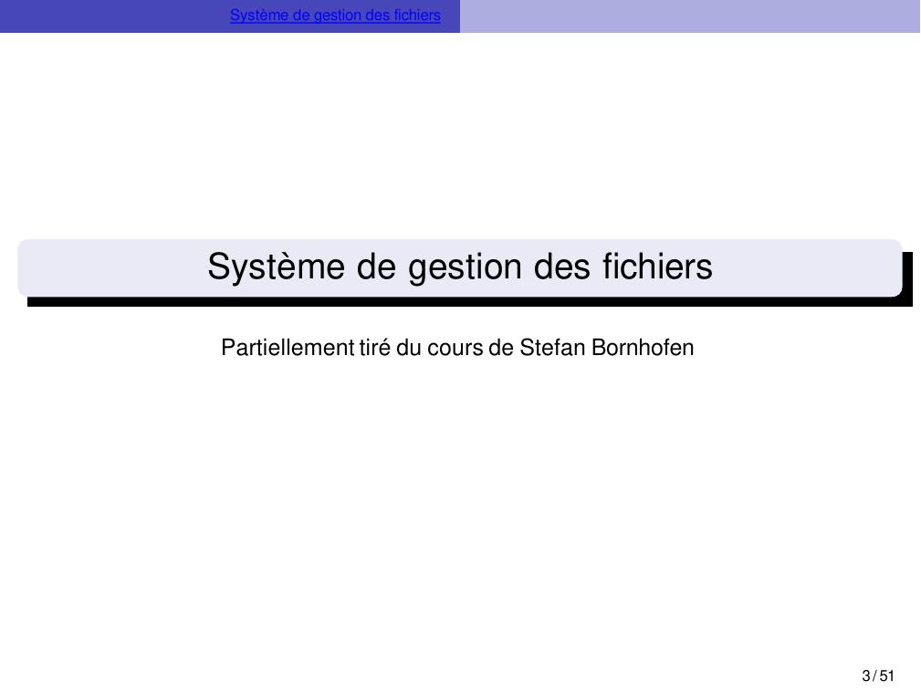 Page 3 : Système de gestion des fichiersSystème de gestion des fichiers3/ 51Partiellement tiré du cours de Stefan Bornhofen