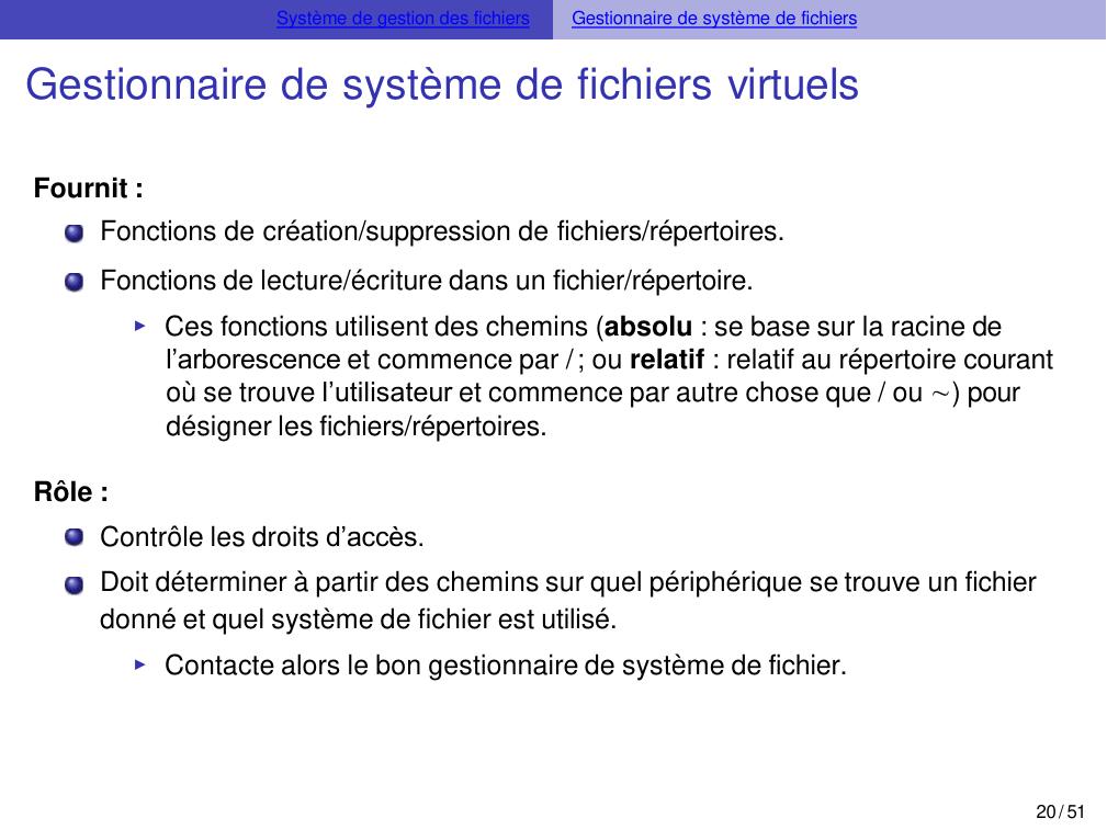 Page 21 : Système de gestion des fichiersGestionnaire de système de fichiersGestionnaire de système de fichiers virtuelsFournit :Fonctions de création/suppression de fichiers/répertoires. Fonctions de lecture/écriture dans un fichier/répertoire.▶Ces fonctions utilisent des chemins absolu : se base sur la racine de l’arborescence et commence par /; ou relatif : relatif au répertoire courant où se trouve l’utilisateur et commence par autre chose que / ou pour désigner les fichiers/répertoires.Rôle :Contrôle les droits d’accès.Doit déterminer à partir des chemins sur quel périphérique se trouve un fichier donné et quel système de fichier est utilisé.▶Contacte alors le bon gestionnaire de système de fichier.20/ 51
