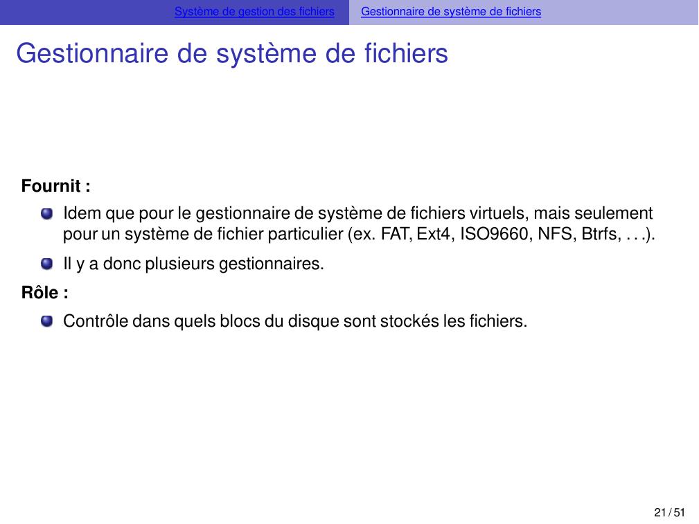 Page 22 : Système de gestion des fichiersGestionnaire de système de fichiersGestionnaire de système de fichiersFournit :Idem que pour le gestionnaire de système de fichiers virtuels, mais seulement pour un système de fichier particulier ex. FAT, Ext4, ISO9660, NFS, Btrfs, . . ..Il y a donc plusieurs gestionnaires.Rôle :Contrôle dans quels blocs du disque sont stockés les fichiers.21/ 51
