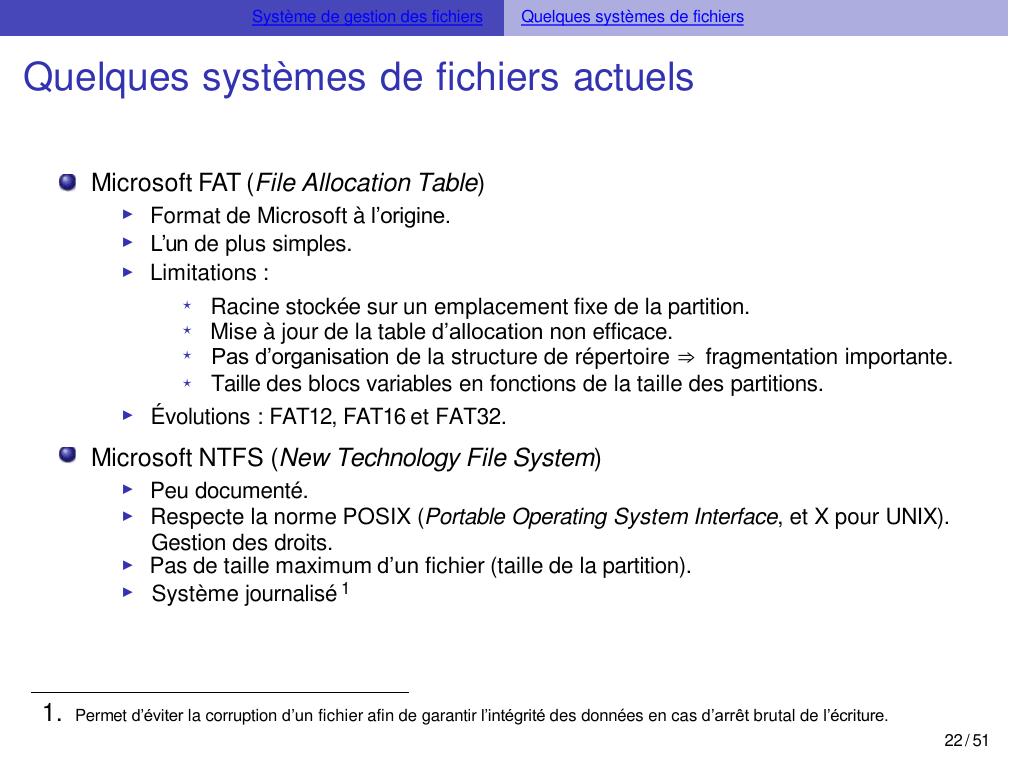 Page 23 : Système de gestion des fichiersQuelques systèmes de fichiersQuelques systèmes de fichiers actuelsMicrosoft FAT File Allocation Table▶Format de Microsoft à l’origine.▶L’un de plus simples.▶Limitations :Racine stockée sur un emplacement fixe de la partition.Mise à jour de la table d’allocation non efficace.Pas d’organisation de la structure de répertoire ⇒fragmentation importante.Taille des blocs variables en fonctions de la taille des partitions.▶Évolutions : FAT12, FAT16 et FAT32.Microsoft NTFS New Technology File System▶Peu documenté.▶Respecte la norme POSIX Portable Operating System Interface, et X pour UNIX.Gestion des droits.▶Pas de taille maximum d’un fichier taille de la partition.▶Système journalisé 11. Permet d’éviter la corruption d’un fichier afin de garantir l’intégrité des données en cas d’arrêt brutal de l’écriture.22/ 51