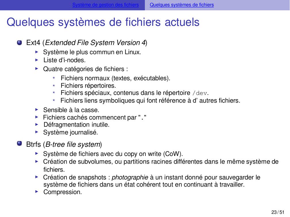 Page 24 : Système de gestion des fichiersQuelques systèmes de fichiersQuelques systèmes de fichiers actuelsExt4 Extended File System Version 4▶Système le plus commun en Linux.▶Liste d’i-nodes.▶Quatre catégories de fichiers :Fichiers normaux textes, exécutables.Fichiers répertoires.Fichiers spéciaux, contenus dans le répertoire /dev.Fichiers liens symboliques qui font référence à d’ autres fichiers.▶Sensible à la casse.▶Fichiers cachés commencent par "."▶Défragmentation inutile.▶Système journalisé.Btrfs B-tree file system▶Système de fichiers avec du copy on write CoW.▶Création de subvolumes, ou partitions racines différentes dans le même système defichiers.▶Création de snapshots : photographie à un instant donné pour sauvegarder lesystème de fichiers dans un état cohérent tout en continuant à travailler.▶Compression.23/ 51