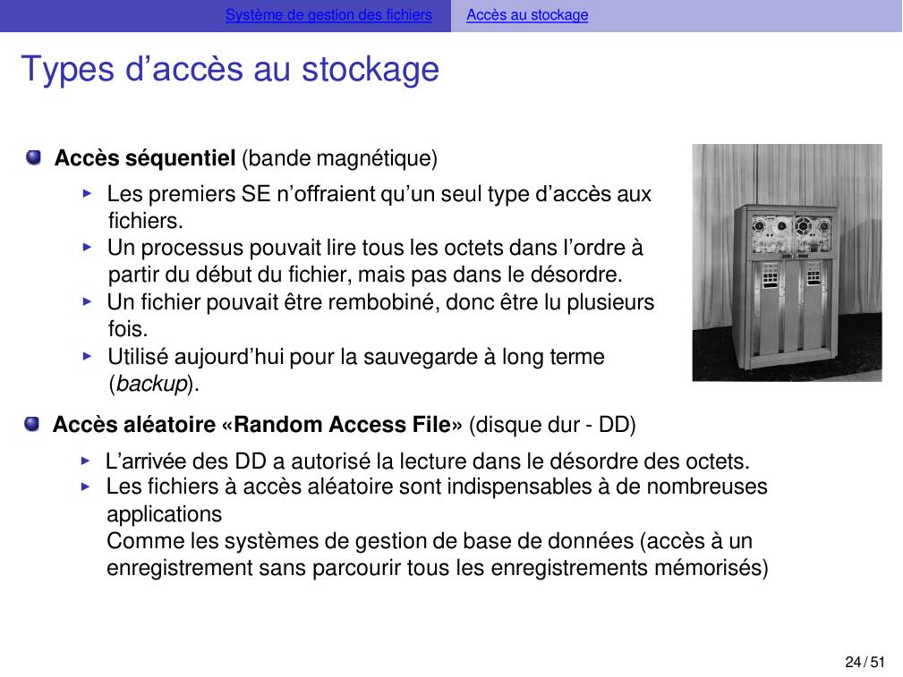 Page 25 : Système de gestion des fichiersAccès au stockageTypes d’accès au stockageAccès séquentiel bande magnétique▶Les premiers SE n’offraient qu’un seul type d’accès aux fichiers.▶Un processus pouvait lire tous les octets dans l’ordre àpartir du début du fichier, mais pas dans le désordre.▶Un fichier pouvait être rembobiné, donc être lu plusieurs fois.▶Utilisé aujourd’hui pour la sauvegarde à long terme backup.Accès aléatoire «Random Access File» disque dur - DD▶L’arrivée des DD a autorisé la lecture dans le désordre des octets.▶Les fichiers à accès aléatoire sont indispensables à de nombreuses applicationsComme les systèmes de gestion de base de données accès à un enregistrement sans parcourir tous les enregistrements mémorisés24/ 51