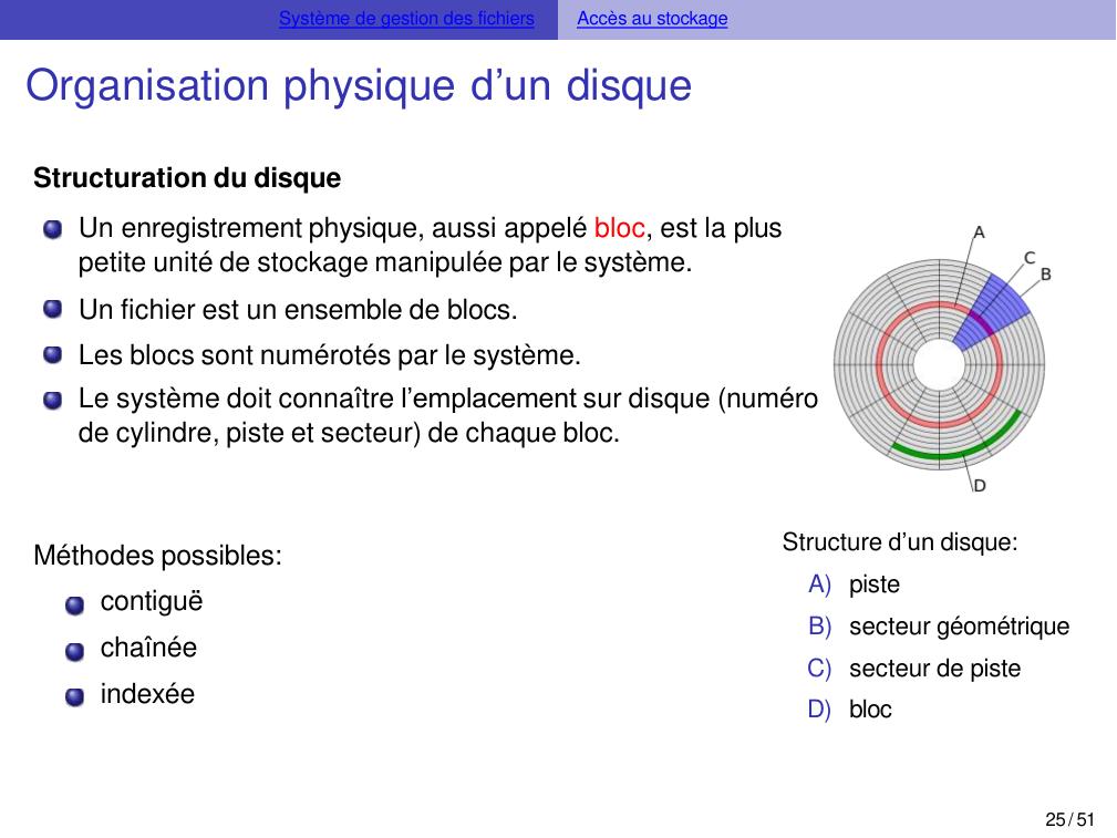 Page 26 : Système de gestion des fichiersAccès au stockageOrganisation physique d’un disqueStructuration du disqueUn enregistrement physique, aussi appelé bloc, est la plus petite unité de stockage manipulée par le système.Un fichier est un ensemble de blocs.Les blocs sont numérotés par le système.Le système doit connaître l’emplacement sur disque numéro de cylindre, piste et secteur de chaque bloc.Structure d’un disque:A pisteB secteur géométriqueC secteur de pisteD blocMéthodes possibles: contiguë chaînée indexée25/ 51