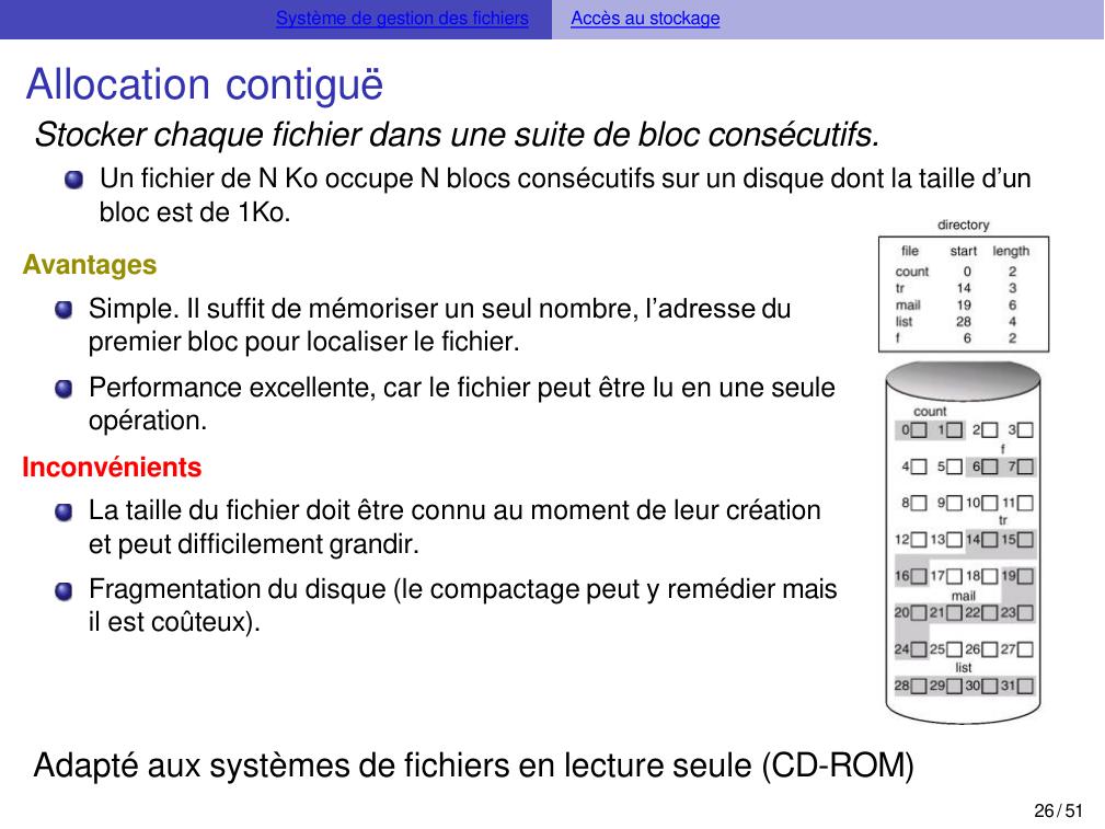 Page 27 : Système de gestion des fichiersAccès au stockageAllocation contiguëStocker chaque fichier dans une suite de bloc consécutifs.Un fichier de N Ko occupe N blocs consécutifs sur un disque dont la taille d’un bloc est de 1Ko.AvantagesSimple. Il suffit de mémoriser un seul nombre, l’adresse du premier bloc pour localiser le fichier.Performance excellente, car le fichier peut être lu en une seule opération.InconvénientsLa taille du fichier doit être connu au moment de leur création et peut difficilement grandir.Fragmentation du disque le compactage peut y remédier mais il est coûteux.Adapté aux systèmes de fichiers en lecture seule CD-ROM26/ 51