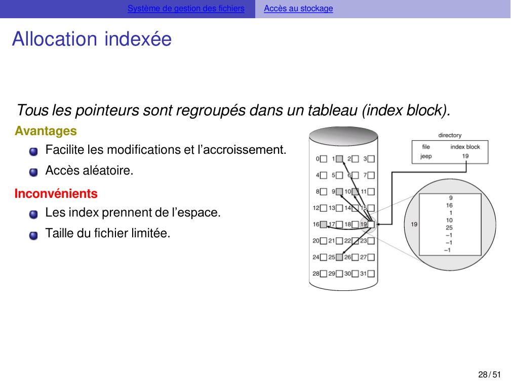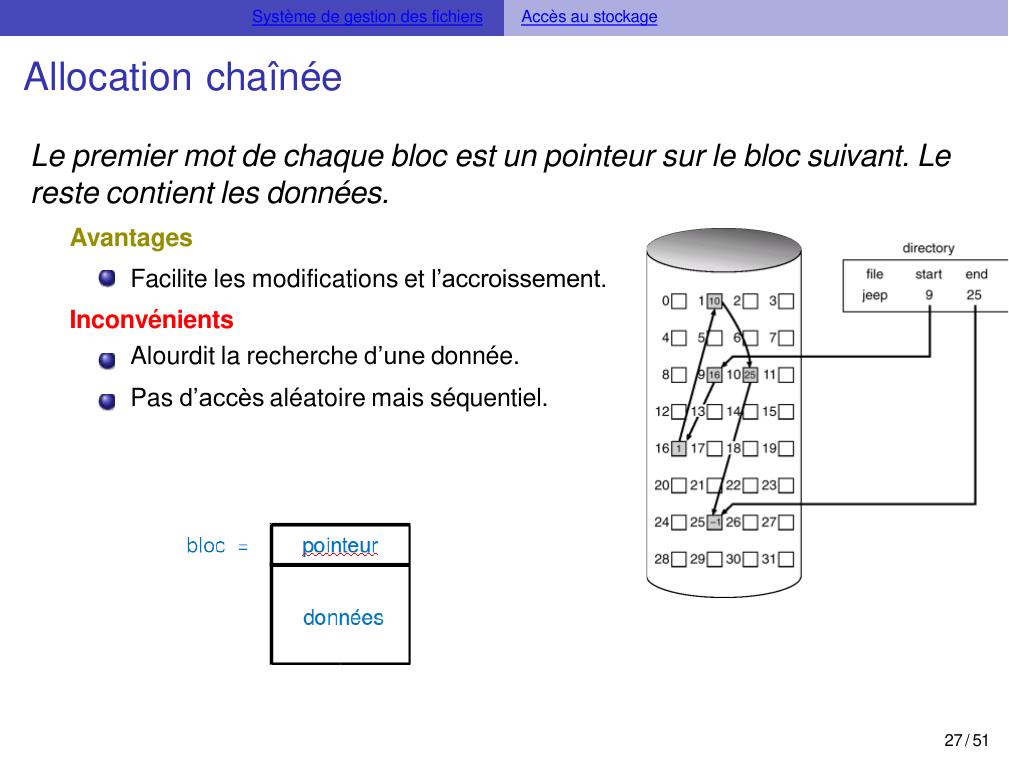 Page 28 : Système de gestion des fichiersAccès au stockageAllocation chaînéeLe premier mot de chaque bloc est un pointeur sur le bloc suivant. Le reste contient les données.AvantagesFacilite les modifications et l’accroissement.InconvénientsAlourdit la recherche d’une donnée. Pas d’accès aléatoire mais séquentiel.27/ 51