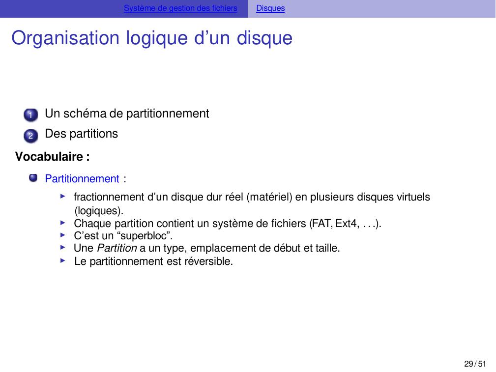 Page 30 : Système de gestion des fichiersDisquesOrganisation logique d’un disque1Un schéma de partitionnement Des partitions2Vocabulaire :Partitionnement :▶fractionnement d’un disque dur réel matériel en plusieurs disques virtuels logiques.▶Chaque partition contient un système de fichiers FAT, Ext4, . . ..▶C’est un “superbloc”.▶Une Partition a un type, emplacement de début et taille.▶Le partitionnement est réversible.29/ 51