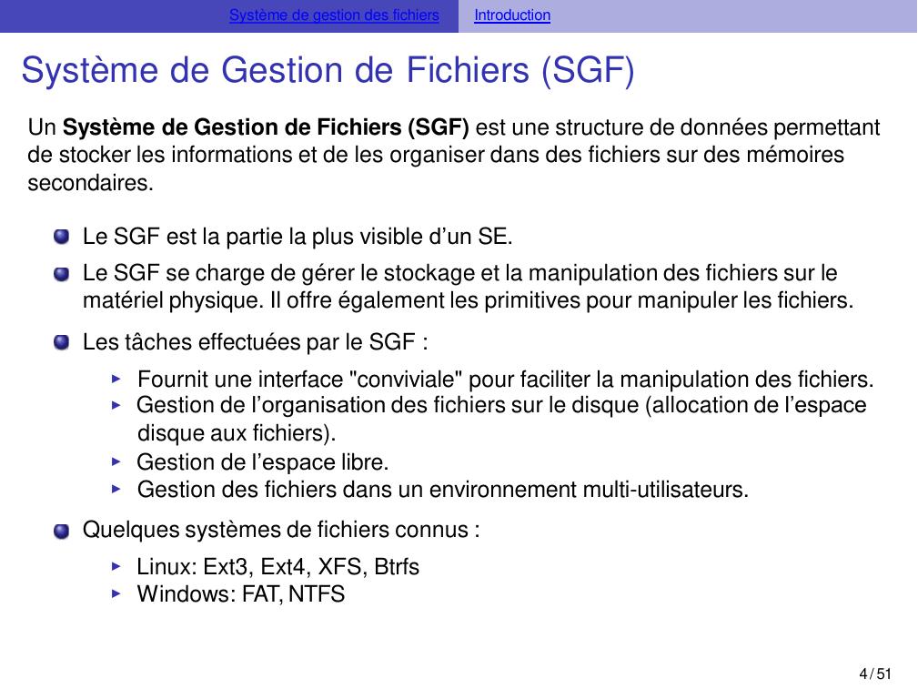 Page 4 : Système de gestion des fichiersIntroductionSystème de Gestion de Fichiers SGFUn Système de Gestion de Fichiers SGF est une structure de données permettant de stocker les informations et de les organiser dans des fichiers sur des mémoires secondaires.Le SGF est la partie la plus visible d’un SE.Le SGF se charge de gérer le stockage et la manipulation des fichiers sur le matériel physique. Il offre également les primitives pour manipuler les fichiers.Les tâches effectuées par le SGF :▶Fournit une interface "conviviale" pour faciliter la manipulation des fichiers.▶Gestion de l’organisation des fichiers sur le disque allocation de l’espace disque aux fichiers.▶Gestion de l’espace libre.▶Gestion des fichiers dans un environnement multi-utilisateurs.Quelques systèmes de fichiers connus :▶Linux: Ext3, Ext4, XFS, Btrfs▶Windows: FAT, NTFS4/ 51