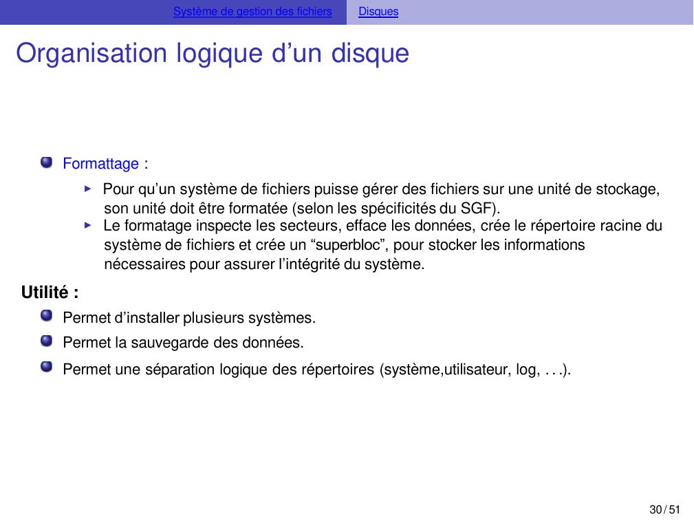 Page 31 : Système de gestion des fichiersDisquesOrganisation logique d’un disqueFormattage :▶Pour qu’un système de fichiers puisse gérer des fichiers sur une unité de stockage, son unité doit être formatée selon les spécificités du SGF.▶Le formatage inspecte les secteurs, efface les données, crée le répertoire racine dusystème de fichiers et crée un “superbloc”, pour stocker les informations nécessaires pour assurer l’intégrité du système.Utilité :Permet d’installer plusieurs systèmes. Permet la sauvegarde des données.Permet une séparation logique des répertoires système,utilisateur, log, . . ..30/ 51