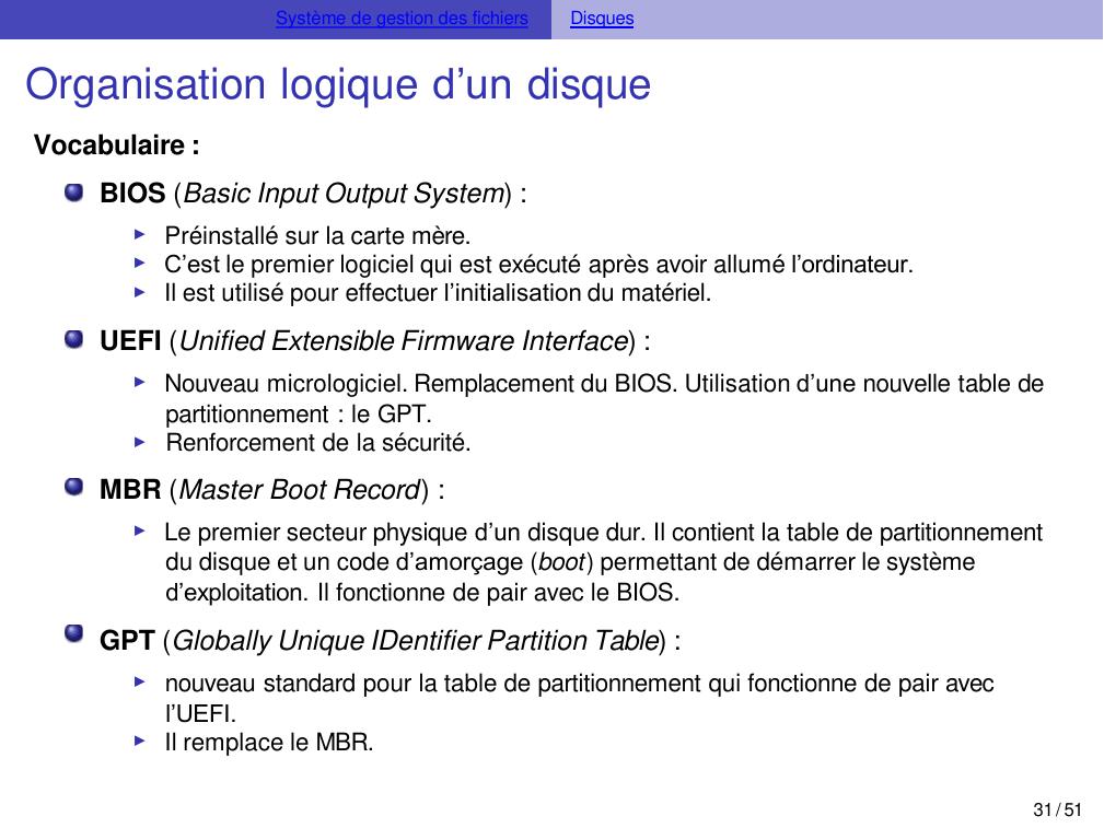 Page 32 : Système de gestion des fichiersDisquesOrganisation logique d’un disqueVocabulaire :BIOS Basic Input Output System :▶Préinstallé sur la carte mère.▶C’est le premier logiciel qui est exécuté après avoir allumé l’ordinateur.▶Il est utilisé pour effectuer l’initialisation du matériel.UEFI Unified Extensible Firmware Interface :▶Nouveau micrologiciel. Remplacement du BIOS. Utilisation d’une nouvelle table departitionnement : le GPT.▶Renforcement de la sécurité.MBR Master Boot Record :▶Le premier secteur physique d’un disque dur. Il contient la table de partitionnement du disque et un code d’amorçage boot permettant de démarrer le système d’exploitation. Il fonctionne de pair avec le BIOS.GPT Globally Unique IDentifier Partition Table :▶nouveau standard pour la table de partitionnement qui fonctionne de pair avec l’UEFI.▶Il remplace le MBR.31/ 51