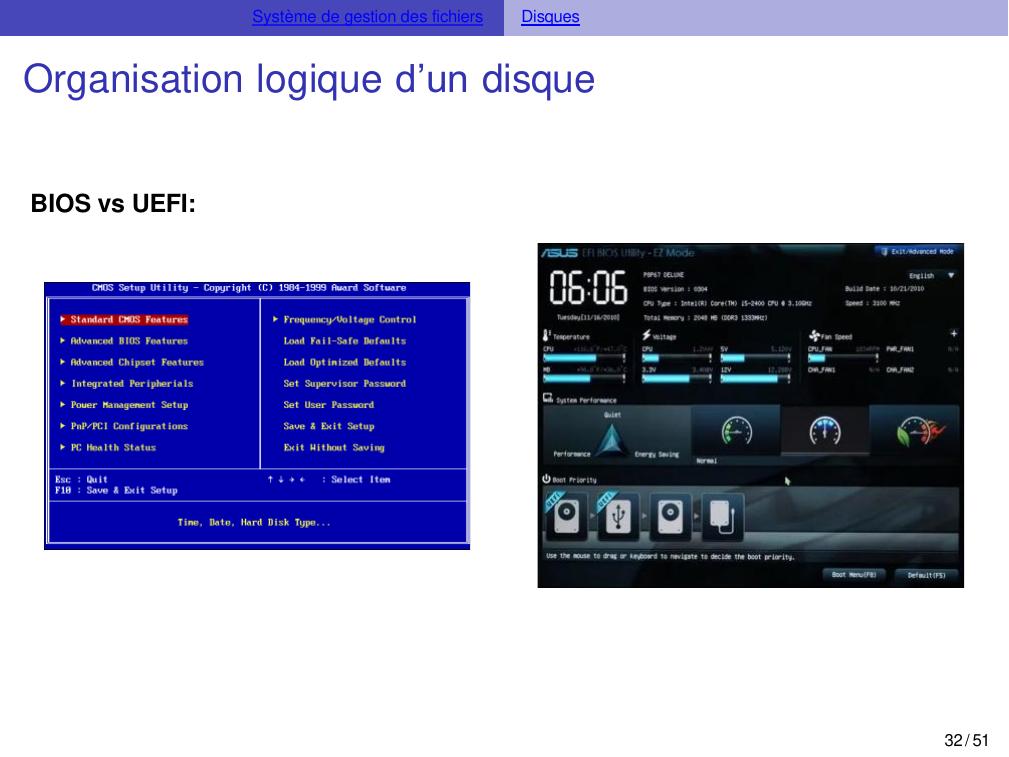 Page 33 : Système de gestion des fichiersDisquesOrganisation logique d’un disqueBIOS vs UEFI:32/ 51