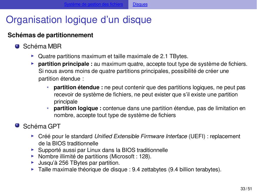 Page 34 : Système de gestion des fichiersDisquesOrganisation logique d’un disqueSchémas de partitionnementSchéma MBR▶Quatre partitions maximum et taille maximale de 2.1 TBytes.▶partition principale : au maximum quatre, accepte tout type de système de fichiers.Si nous avons moins de quatre partitions principales, possibilité de créer unepartition étendue :partition étendue : ne peut contenir que des partitions logiques, ne peut pasrecevoir de système de fichiers, ne peut exister que s’il existe une partition principalepartition logique : contenue dans une partition étendue, pas de limitation ennombre, accepte tout type de système de fichiersSchéma GPT▶Créé pour le standard Unified Extensible Firmware Interface UEFI : replacement de la BIOS traditionnelle▶Supporté aussi par Linux dans la BIOS traditionnelle▶Nombre illimité de partitions Microsoft : 128.▶Jusqu’à 256 TBytes par partition.▶Taille maximale théorique de disque : 9.4 zettabytes 9.4 billion terabytes.33/ 51