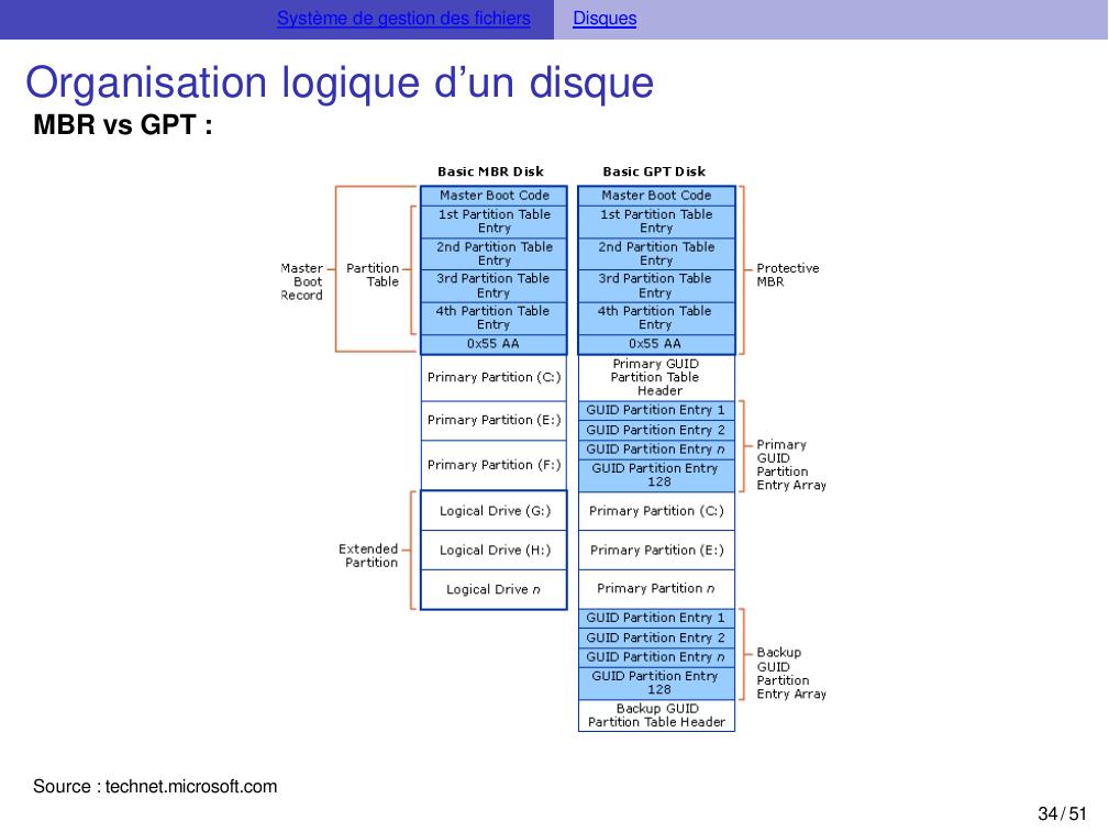 Page 35 : Système de gestion des fichiersDisquesOrganisation logique d’un disqueMBR vs GPT :Source : technet.microsoft.com34/ 51