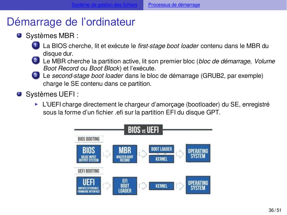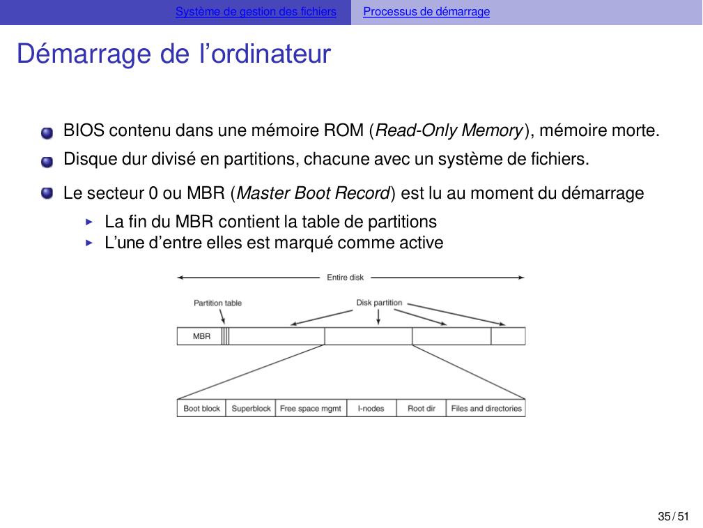 Page 36 : Système de gestion des fichiersProcessus de démarrageDémarrage de l’ordinateurBIOS contenu dans une mémoire ROM Read-Only Memory, mémoire morte. Disque dur divisé en partitions, chacune avec un système de fichiers.Le secteur 0 ou MBR Master Boot Record est lu au moment du démarrage▶La fin du MBR contient la table de partitions▶L’une d’entre elles est marqué comme active35/ 51