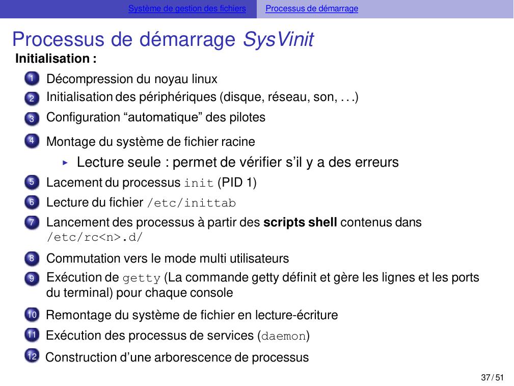 Page 38 : Système de gestion des fichiersProcessus de démarrageProcessus de démarrage SysVinitInitialisation :1Décompression du noyau linuxInitialisation des périphériques disque, réseau, son, ... Configuration “automatique” des pilotesMontage du système de fichier racine▶Lecture seule : permet de vérifier s’il y a des erreursLacement du processus init PID 1 Lecture du fichier /etc/inittabLancement des processus à partir des scripts shell contenus dans/etc/rcn.d/Commutation vers le mode multi utilisateursExécution de getty La commande getty définit et gère les lignes et les ports du terminal pour chaque console2345678910 Remontage du système de fichier en lecture-écriture11 Exécution des processus de services daemon12 Construction d’une arborescence de processus37/ 51
