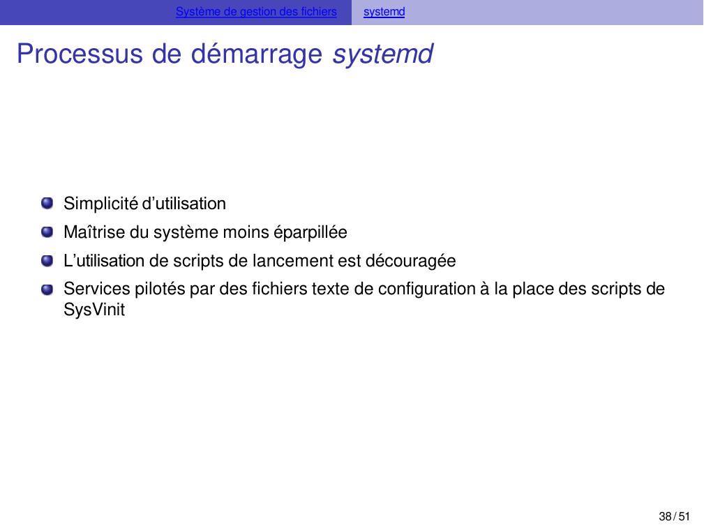 Page 39 : Système de gestion des fichierssystemdProcessus de démarrage systemdSimplicité d’utilisationMaîtrise du système moins éparpilléeL’utilisation de scripts de lancement est découragéeServices pilotés par des fichiers texte de configuration à la place des scripts de SysVinit38/ 51