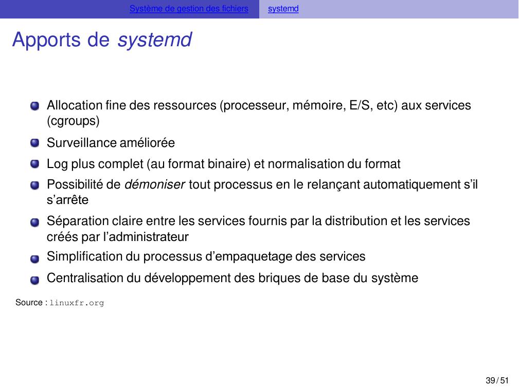 Page 40 : Système de gestion des fichierssystemdApports de systemdAllocation fine des ressources processeur, mémoire, E/S, etc aux services cgroupsSurveillance amélioréeLog plus complet au format binaire et normalisation du formatPossibilité de démoniser tout processus en le relançant automatiquement s’il s’arrêteSéparation claire entre les services fournis par la distribution et les services créés par l’administrateurSimplification du processus d’empaquetage des services Centralisation du développement des briques de base du systèmeSource : linuxfr.org39/ 51