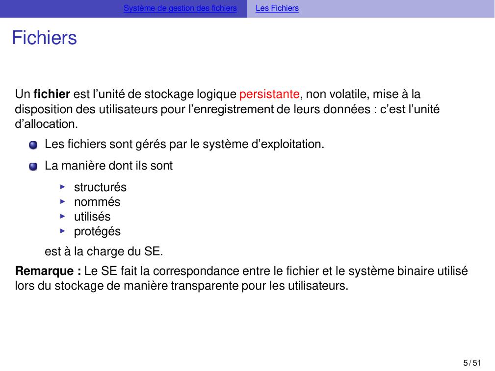 Page 5 : Système de gestion des fichiersLes FichiersFichiersUn fichier est l’unité de stockage logique persistante, non volatile, mise à la disposition des utilisateurs pour l’enregistrement de leurs données : c’est l’unité d’allocation.Les fichiers sont gérés par le système d’exploitation. La manière dont ils sont▶structurés▶nommés▶utilisés▶protégésest à la charge du SE.Remarque : Le SE fait la correspondance entre le fichier et le système binaire utilisé lors du stockage de manière transparente pour les utilisateurs.5/ 51