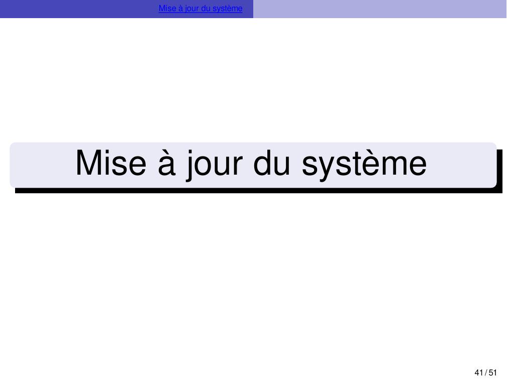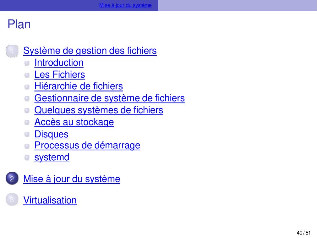 Page 41 : Mise à jour du systèmePlan1Système de gestion des fichiersIntroductionLes FichiersHiérarchie de fichiersGestionnaire de système de fichiersQuelques systèmes de fichiersAccès au stockageDisquesProcessus de démarragesystemd2Mise à jour du systèmeVirtualisation340/ 51