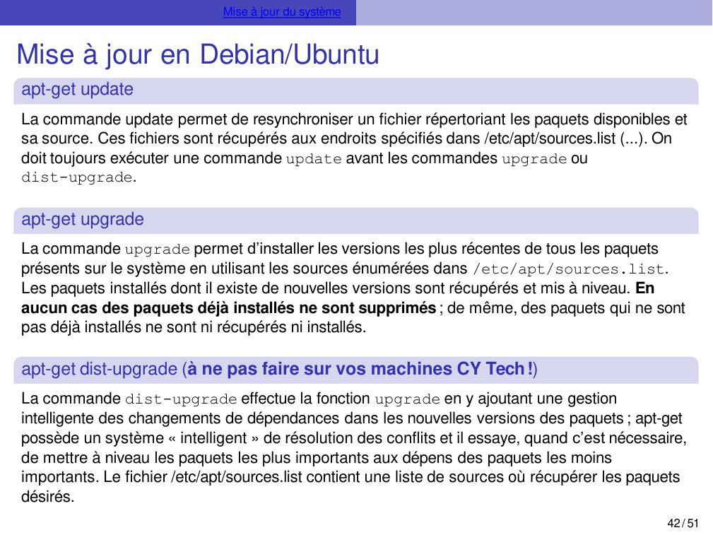 Page 43 : Mise à jour du systèmeMise à jour en Debian/Ubuntuapt-get updateLa commande update permet de resynchroniser un fichier répertoriant les paquets disponibles etsa source. Ces fichiers sont récupérés aux endroits spécifiés dans /etc/apt/sources.list .... Ondoit toujours exécuter une commande update avant les commandes upgrade oudist-upgrade.apt-get upgradeLa commande upgrade permet d’installer les versions les plus récentes de tous les paquets présents sur le système en utilisant les sources énumérées dans /etc/apt/sources.list. Les paquets installés dont il existe de nouvelles versions sont récupérés et mis à niveau. Enaucun cas des paquets déjà installés ne sont supprimés; de même, des paquets qui ne sont pas déjà installés ne sont ni récupérés ni installés.apt-get dist-upgrade à ne pas faire sur vos machines CY Tech!La commande dist-upgrade effectue la fonction upgrade en y ajoutant une gestionintelligente des changements de dépendances dans les nouvelles versions des paquets ; apt-getpossède un système « intelligent » de résolution des conflits et il essaye, quand c’est nécessaire, de mettre à niveau les paquets les plus importants aux dépens des paquets les moinsimportants. Le fichier /etc/apt/sources.list contient une liste de sources où récupérer les paquets désirés.42/ 51