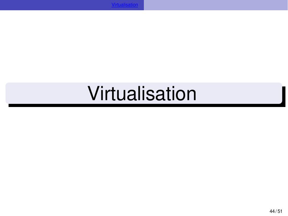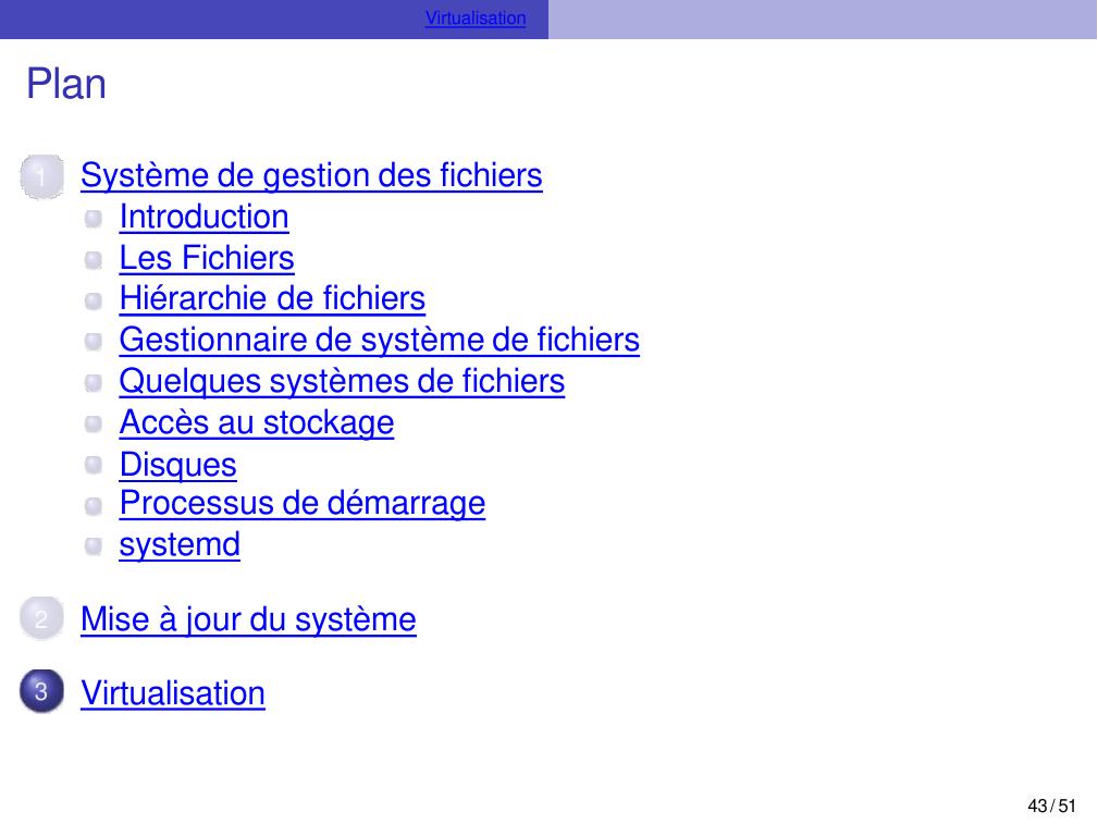 Page 44 : VirtualisationPlan1Système de gestion des fichiersIntroductionLes FichiersHiérarchie de fichiersGestionnaire de système de fichiersQuelques systèmes de fichiersAccès au stockageDisquesProcessus de démarragesystemd2Mise à jour du systèmeVirtualisation343/ 51