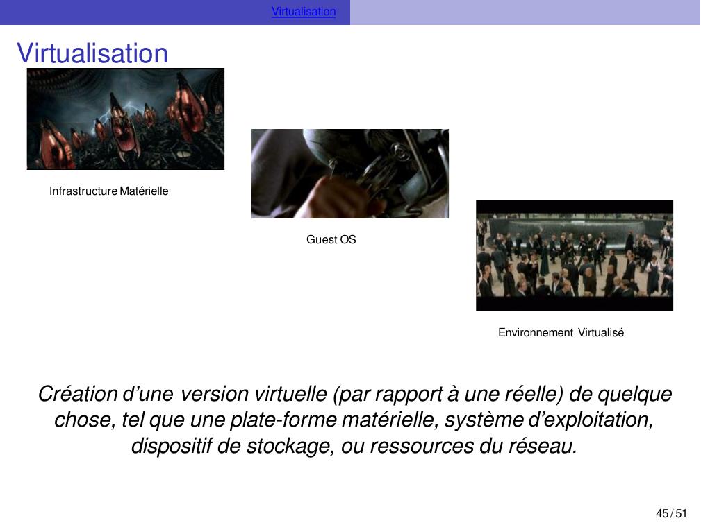Page 46 : VirtualisationVirtualisationInfrastructure MatérielleGuest OSEnvironnement Virtualisé45/ 51Création d’une version virtuelle par rapport à une réelle de quelque chose, tel que une plate-forme matérielle, système d’exploitation, dispositif de stockage, ou ressources du réseau.