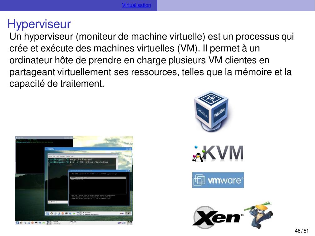 Page 47 : VirtualisationHyperviseurUn hyperviseur moniteur de machine virtuelle est un processus qui crée et exécute des machines virtuelles VM. Il permet à un ordinateur hôte de prendre en charge plusieurs VM clientes en partageant virtuellement ses ressources, telles que la mémoire et la capacité de traitement.46/ 51