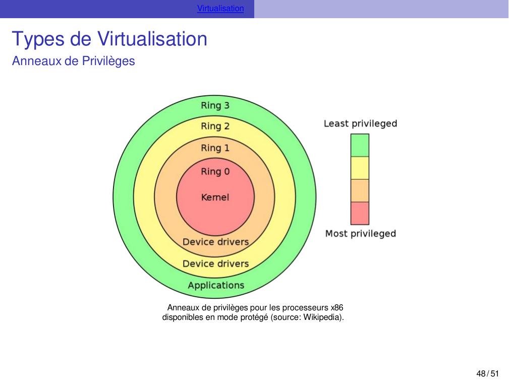 Page 49 : VirtualisationTypes de VirtualisationAnneaux de PrivilègesAnneaux de privilèges pour les processeurs x86disponibles en mode protégé source: Wikipedia.48/ 51