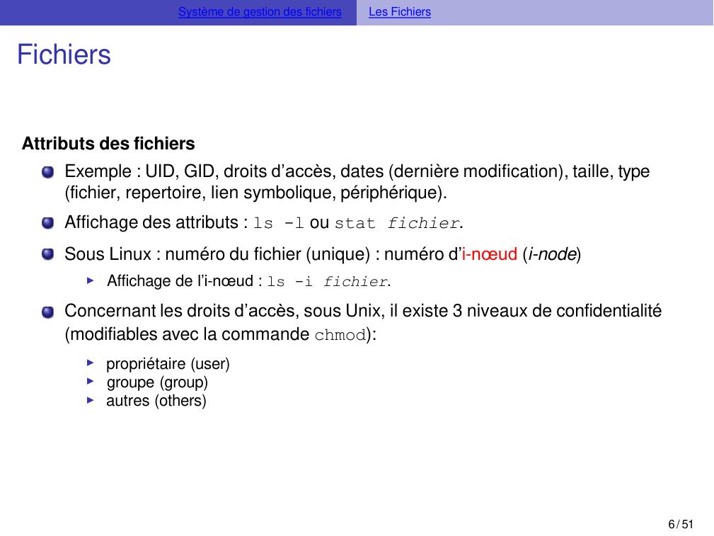 Page 6 : Système de gestion des fichiersLes FichiersFichiersAttributs des fichiersExemple : UID, GID, droits d’accès, dates dernière modification, taille, type fichier, repertoire, lien symbolique, périphérique.Affichage des attributs : ls -l ou stat fichier.Sous Linux : numéro du fichier unique : numéro d’i-nœud i-node▶Affichage de l’i-nœud : ls -i fichier.Concernant les droits d’accès, sous Unix, il existe 3 niveaux de confidentialité modifiables avec la commande chmod:▶propriétaire user▶groupe group▶autres others6/ 51
