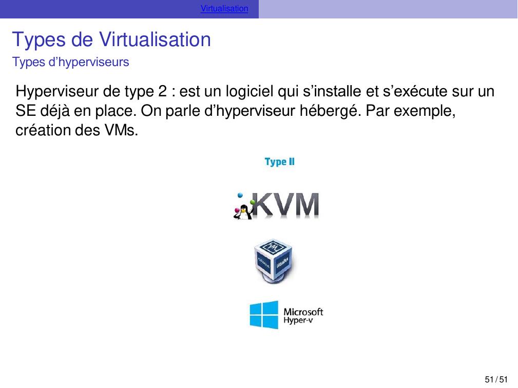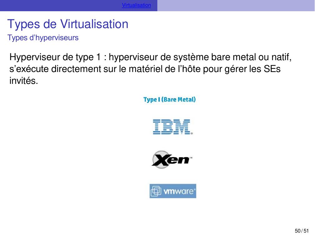 Page 51 : VirtualisationTypes de VirtualisationTypes d’hyperviseursHyperviseur de type 1 : hyperviseur de système bare metal ou natif, s’exécute directement sur le matériel de l’hôte pour gérer les SEs invités.50/ 51