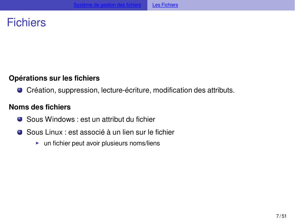 Page 7 : Système de gestion des fichiersLes FichiersFichiersOpérations sur les fichiersCréation, suppression, lecture-écriture, modification des attributs.Noms des fichiersSous Windows : est un attribut du fichierSous Linux : est associé à un lien sur le fichier▶un fichier peut avoir plusieurs noms/liens7/ 51