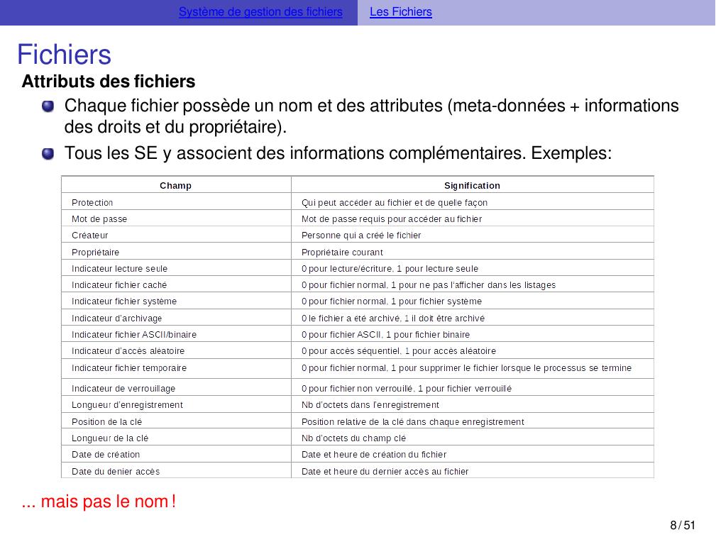Page 8 : Système de gestion des fichiersLes FichiersFichiersAttributs des fichiersChaque fichier possède un nom et des attributes meta-données + informations des droits et du propriétaire.Tous les SE y associent des informations complémentaires. Exemples:... mais pas le nom!8/ 51