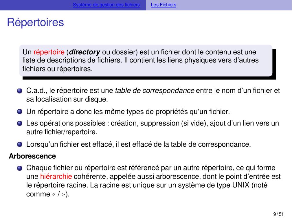 Page 9 : Système de gestion des fichiersLes FichiersRépertoiresUn répertoire directory ou dossier est un fichier dont le contenu est uneliste de descriptions de fichiers. Il contient les liens physiques vers d’autres fichiers ou répertoires.C.a.d., le répertoire est une table de correspondance entre le nom d’un fichier et sa localisation sur disque.Un répertoire a donc les même types de propriétés qu’un fichier.Les opérations possibles : création, suppression si vide, ajout d’un lien vers un autre fichier/repertoire.Lorsqu’un fichier est effacé, il est effacé de la table de correspondance.ArborescenceChaque fichier ou répertoire est référencé par un autre répertoire, ce qui forme une hiérarchie cohérente, appelée aussi arborescence, dont le point d’entrée est le répertoire racine. La racine est unique sur un système de type UNIX noté comme « / ».9/ 51