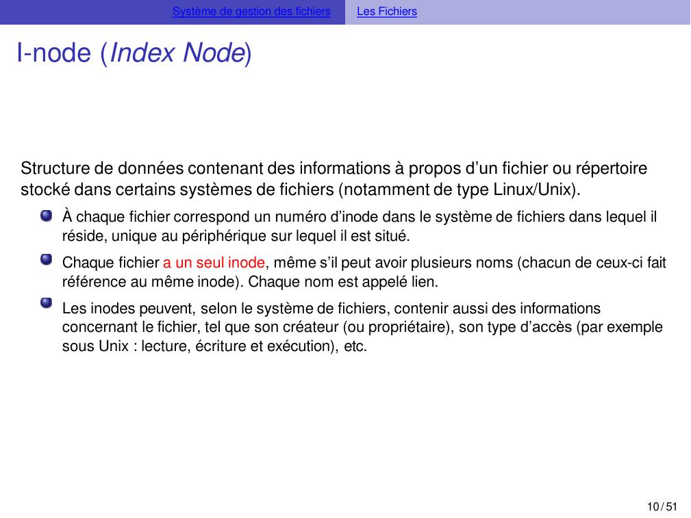 Page 10 : Système de gestion des fichiersLes FichiersI-node Index NodeStructure de données contenant des informations à propos d’un fichier ou répertoire stocké dans certains systèmes de fichiers notamment de type Linux/Unix.À chaque fichier correspond un numéro d’inode dans le système de fichiers dans lequel ilréside, unique au périphérique sur lequel il est situé.Chaque fichier a un seul inode, même s’il peut avoir plusieurs noms chacun de ceux-ci fait référence au même inode. Chaque nom est appelé lien.Les inodes peuvent, selon le système de fichiers, contenir aussi des informations concernant le fichier, tel que son créateur ou propriétaire, son type d’accès par exemple sous Unix : lecture, écriture et exécution, etc.10/ 51