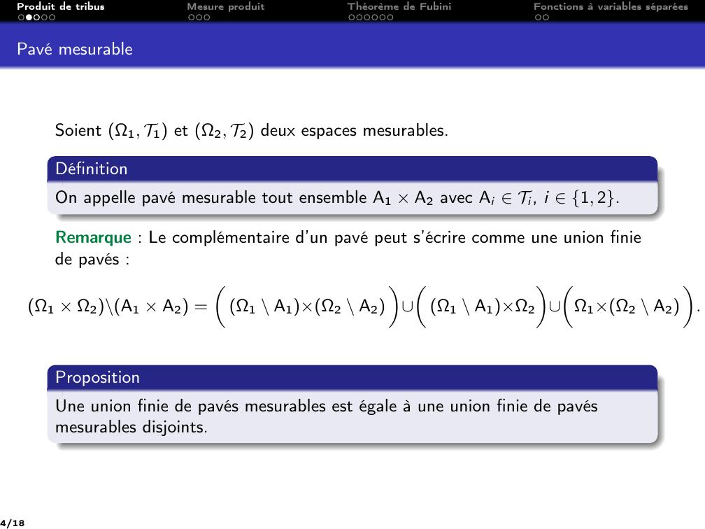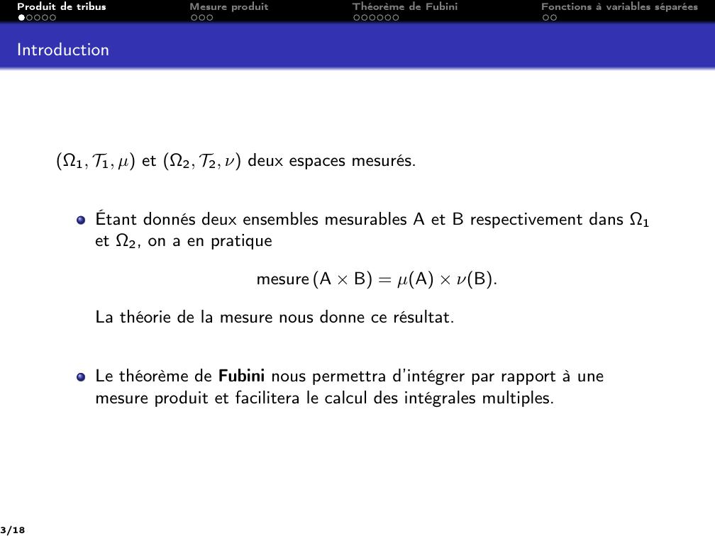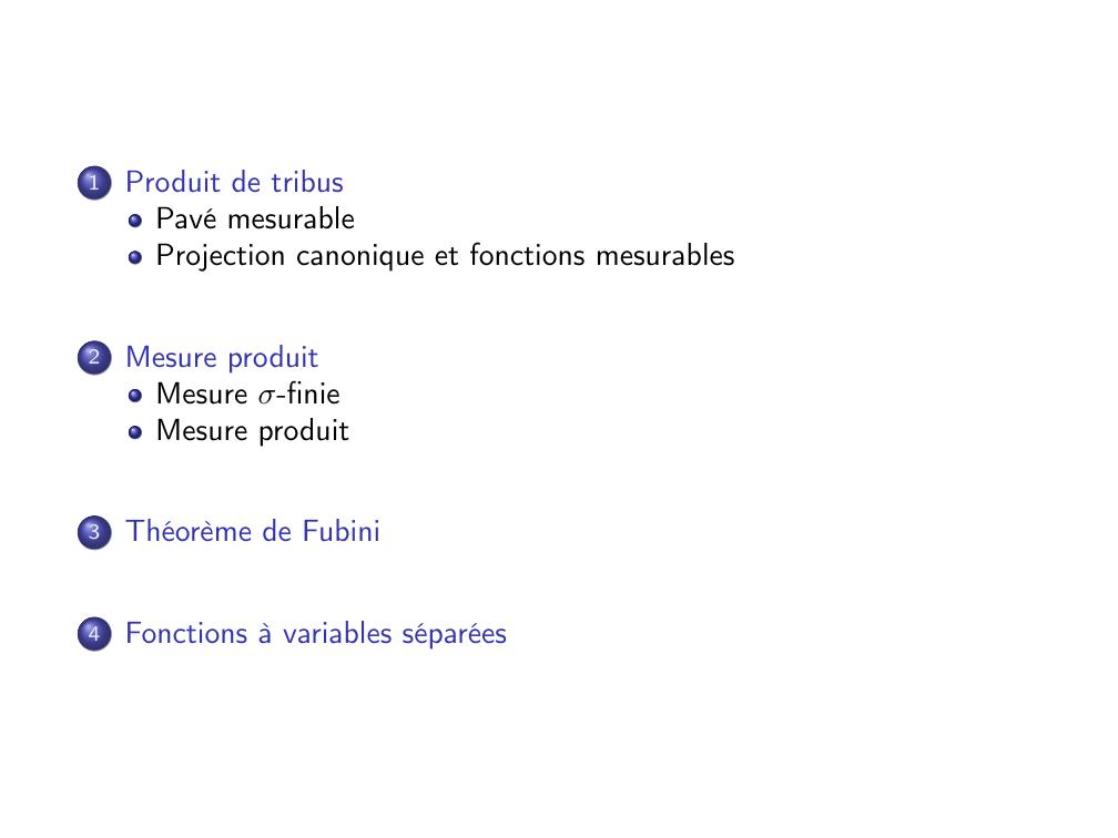 Page 2 : 1Produit de tribusPavé mesurableProjection canonique et fonctions mesurables2Mesure produitMesure σ-finieMesure produit3Théorème de Fubini4Fonctions à variables séparées