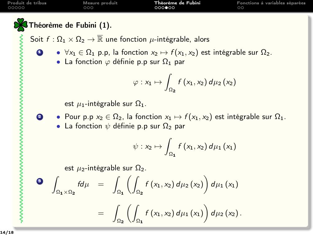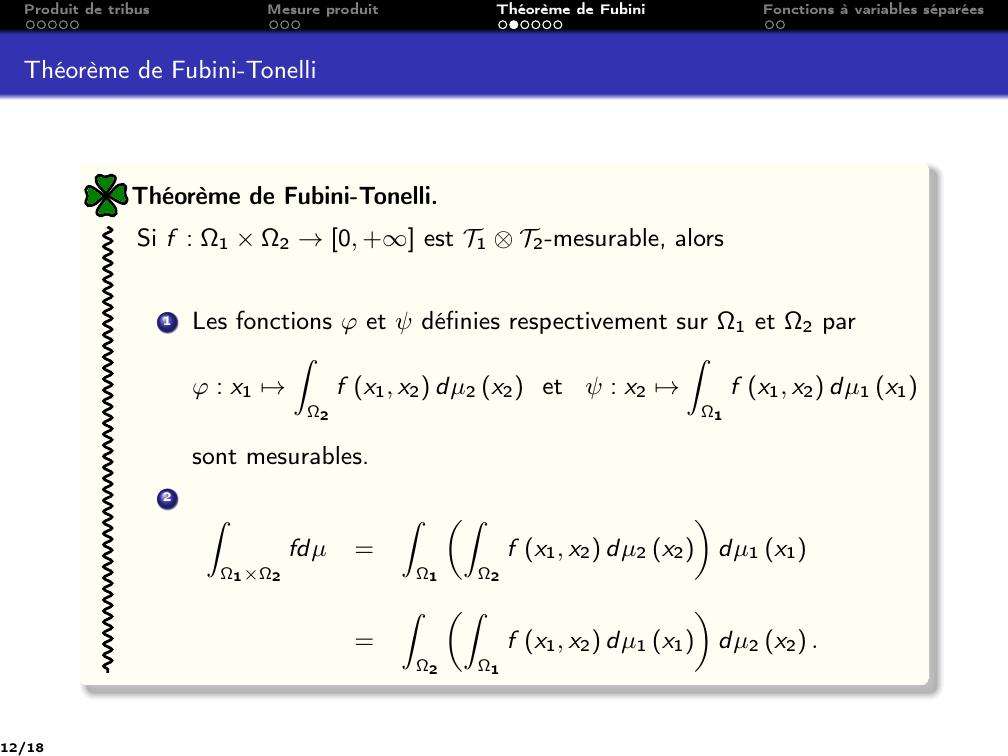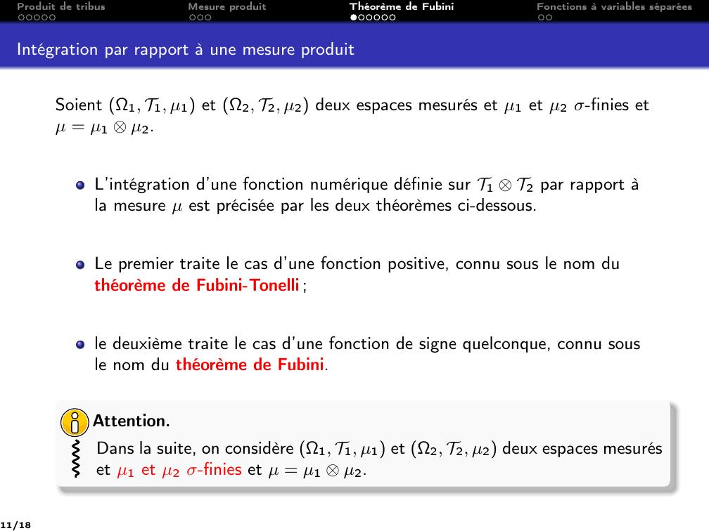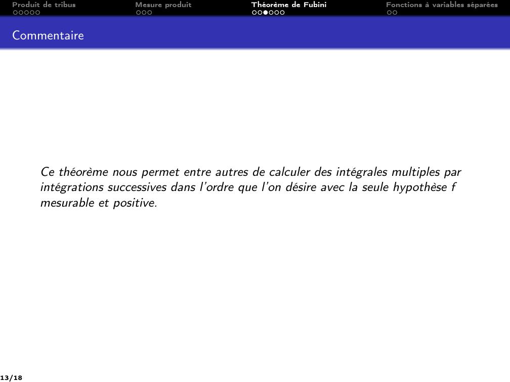 Page 13 : Produit de tribusMesure produitThéorème de FubiniFonctions à variables séparéesCommentaireCe théorème nous permet entre autres de calculer des intégrales multiples parintégrations successives dans l’ordre que l’on désire avec la seule hypothèse fmesurable et positive.13/18