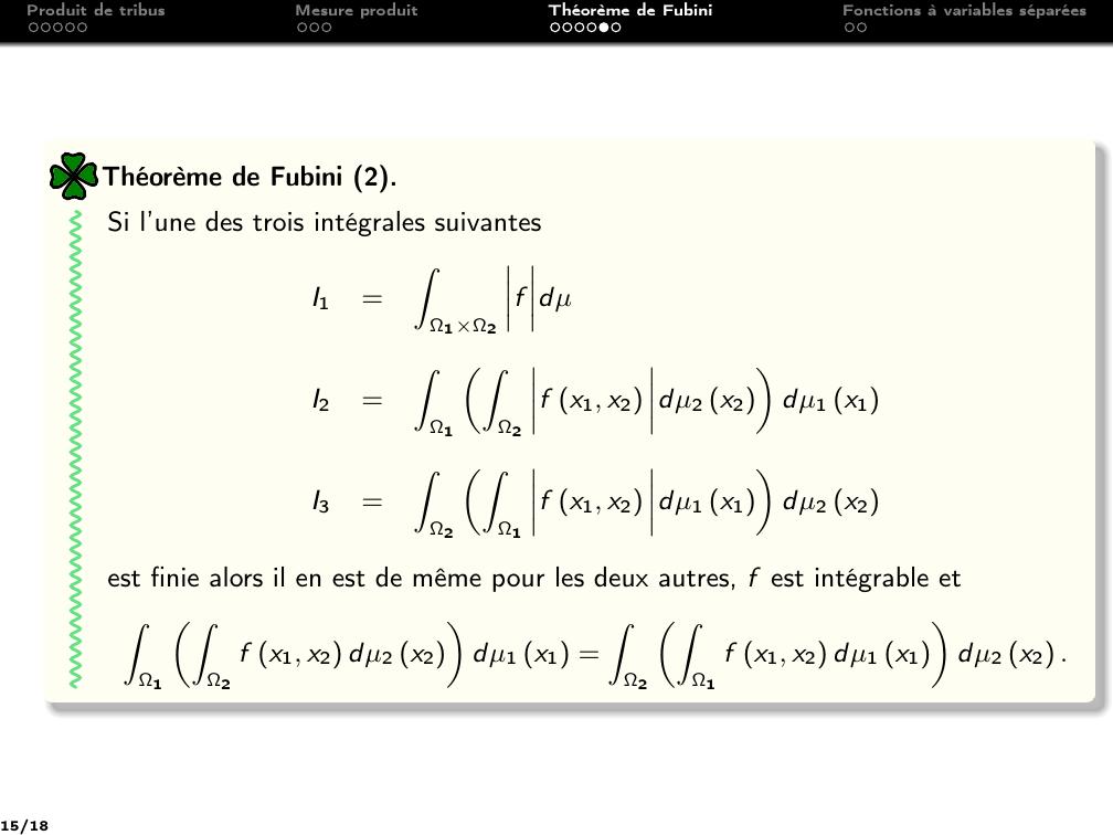 Page 15 : Produit de tribusMesure produitThéorème de FubiniFonctions à variables séparéesSi l’une des trois intégrales suivantesI1=ZΩ1×Ω2fdµI2=ZΩ1ZΩ2f x1, x2dµ2 x2dµ1 x1I3=ZΩ2ZΩ1f x1, x2dµ1 x1dµ2 x2est finie alors il en est de même pour les deux autres, f est intégrable etZΩ1ZΩ2f x1, x2 dµ2 x2dµ1 x1 =ZΩ2ZΩ1f x1, x2 dµ1 x1dµ2 x2 .Théorème de Fubini 2.15/18