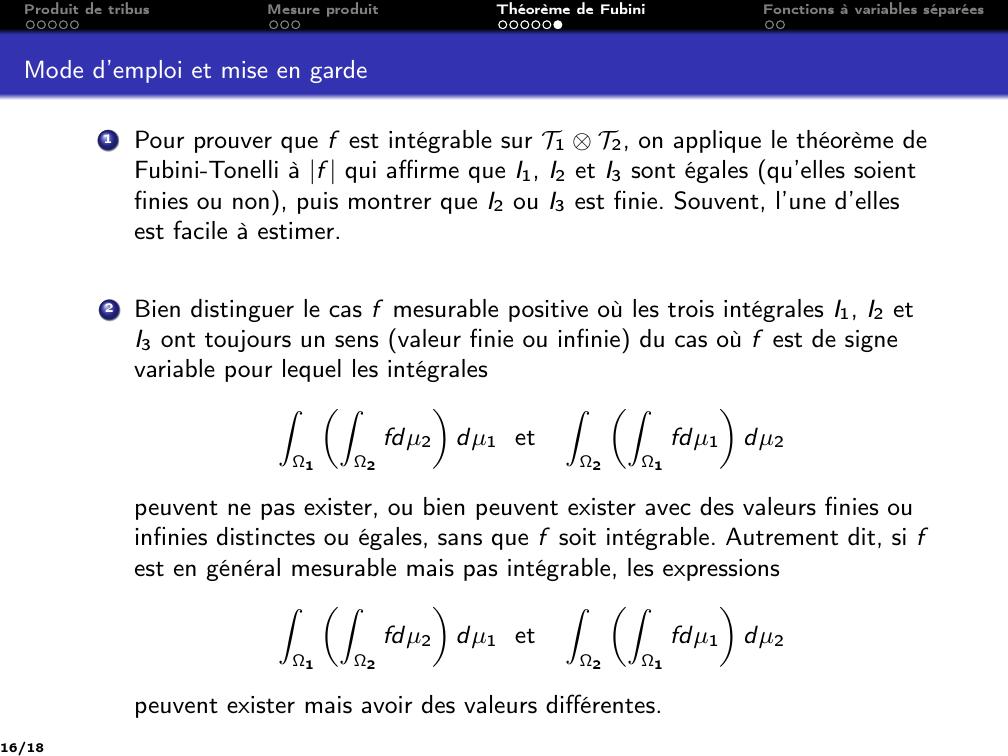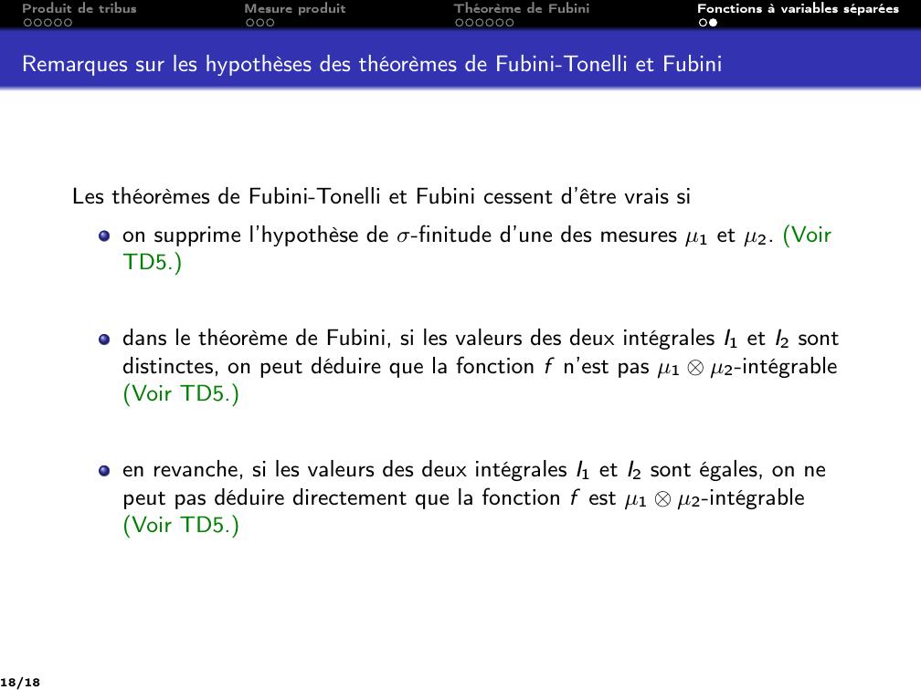 Page 18 : Produit de tribusMesure produitThéorème de FubiniFonctions à variables séparéesRemarques sur les hypothèses des théorèmes de Fubini-Tonelli et FubiniLes théorèmes de Fubini-Tonelli et Fubini cessent d’être vrais sion supprime l’hypothèse de σ-finitude d’une des mesures µ1 et µ2. VoirTD5.dans le théorème de Fubini, si les valeurs des deux intégrales I1 et I2 sontdistinctes, on peut déduire que la fonction f n’est pas µ1 µ2-intégrableVoir TD5.en revanche, si les valeurs des deux intégrales I1 et I2 sont égales, on nepeut pas déduire directement que la fonction f est µ1 µ2-intégrableVoir TD5.18/18