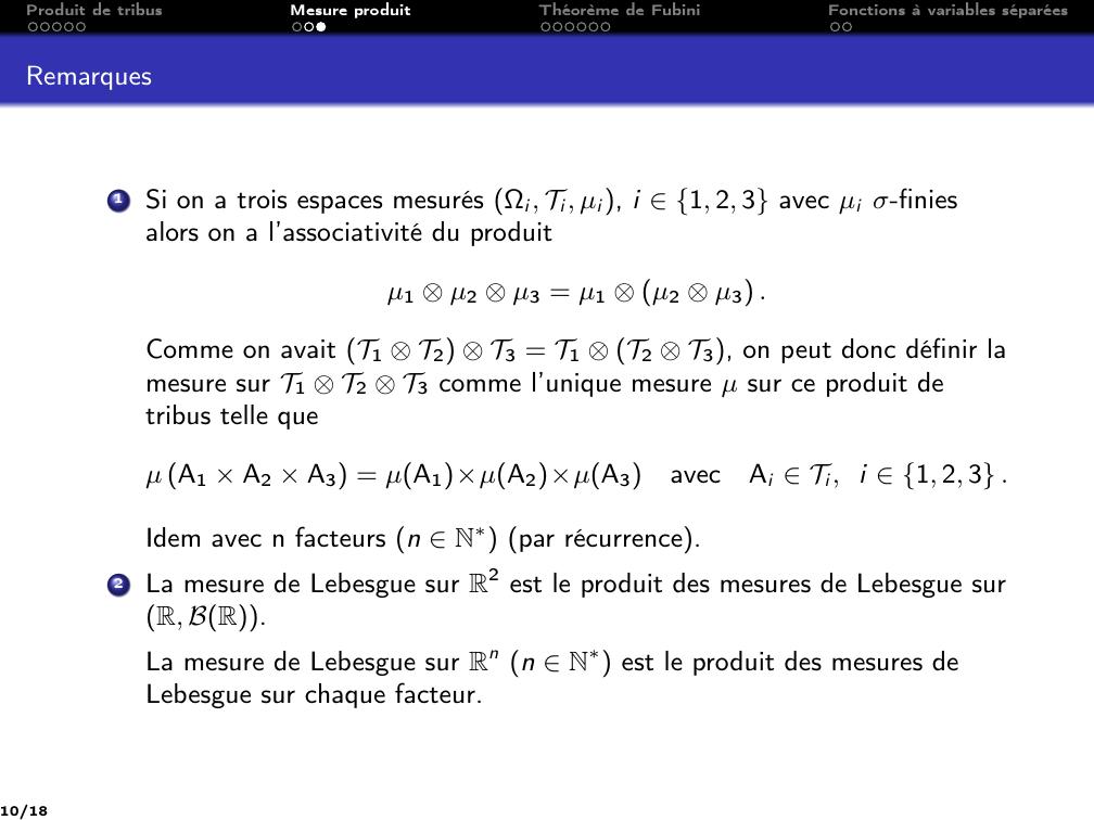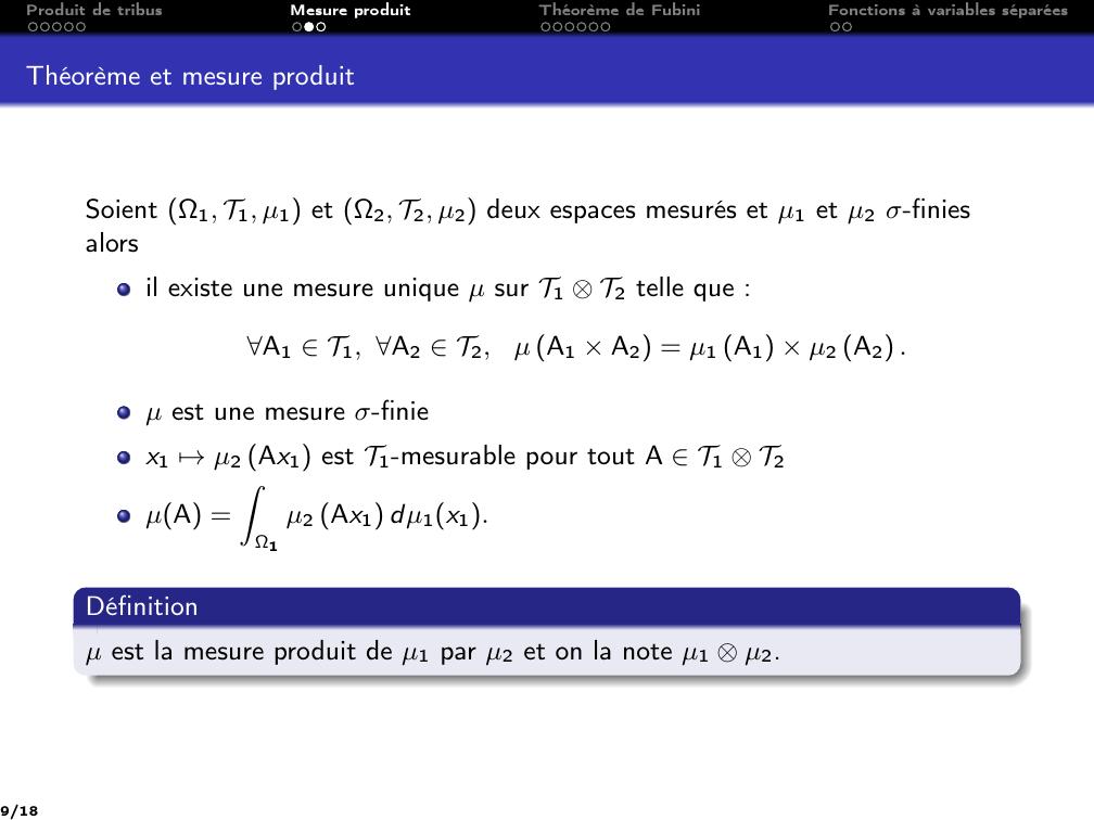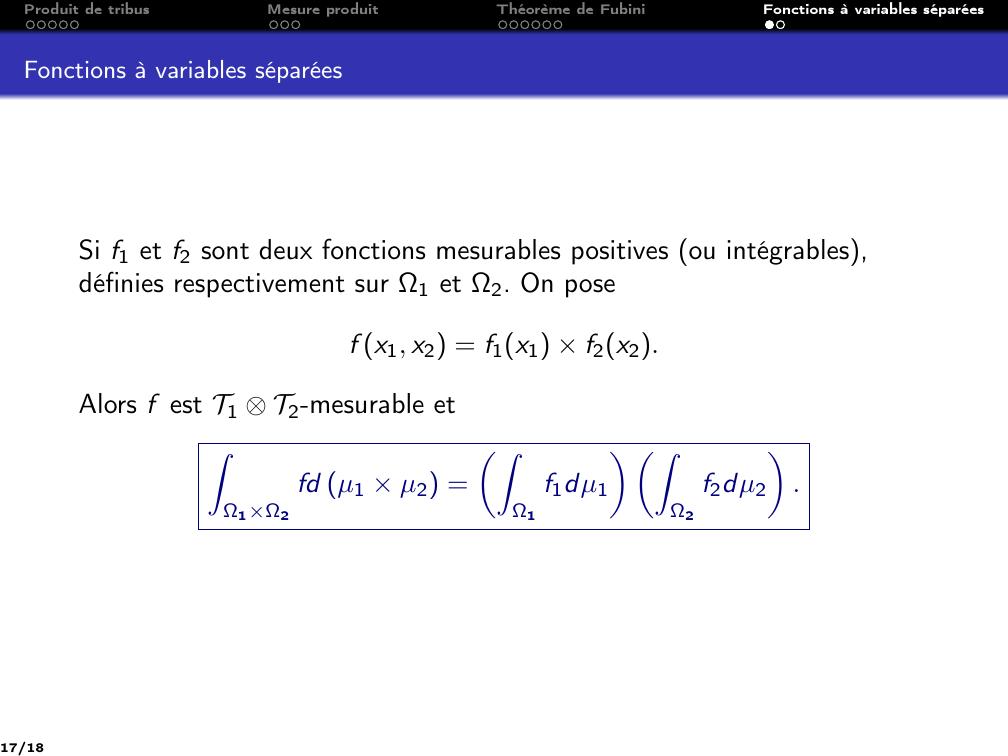 Page 17 : Produit de tribusMesure produitThéorème de FubiniFonctions à variables séparéesFonctions à variables séparéesSi f1 et f2 sont deux fonctions mesurables positives ou intégrables,définies respectivement sur Ω1 et Ω2. On posef x1, x2 = f1x1 × f2x2.Alors f est T1 T2-mesurable etZΩ1×Ω2fd µ1 × µ2 =ZΩ1f1dµ1 ZΩ2f2dµ2.17/18