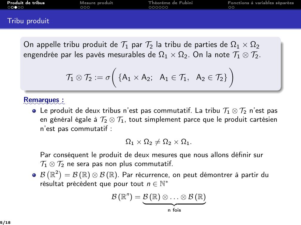 Page 5 : Produit de tribusMesure produitThéorème de FubiniFonctions à variables séparéesTribu produitOn appelle tribu produit de T1 par T2 la tribu de parties de Ω1 × Ω2engendrée par les pavés mesurables de Ω1 × Ω2. On la note T1 T2.T1 T2 := σA1 × A2;A1 T1,A2 T2:::::::::Remarques ::Le produit de deux tribus n’est pas commutatif. La tribu T1 T2 n’est pasen général égale à T2 T1, tout simplement parce que le produit cartésienn’est pas commutatif :Ω1 × Ω2 ̸= Ω2 × Ω1.Par conséquent le produit de deux mesures que nous allons définir surT1 T2 ne sera pas non plus commutatif.BR2= B R B R. Par récurrence, on peut démontrer à partir durésultat précédent que pour tout n NB Rn = B R . . . B Rzn fois5/18