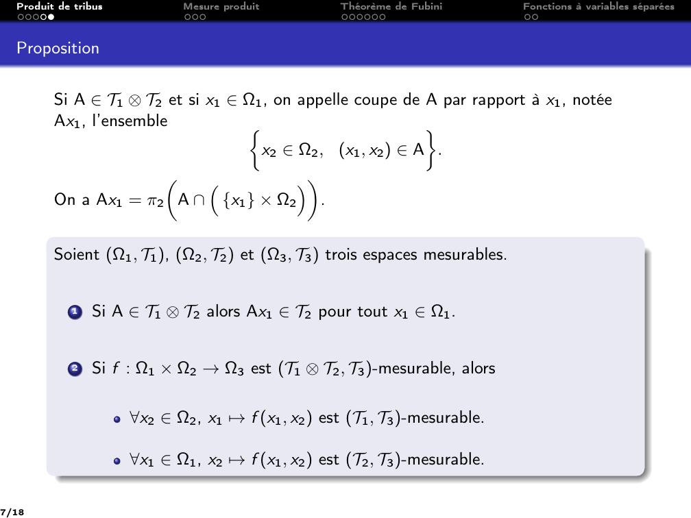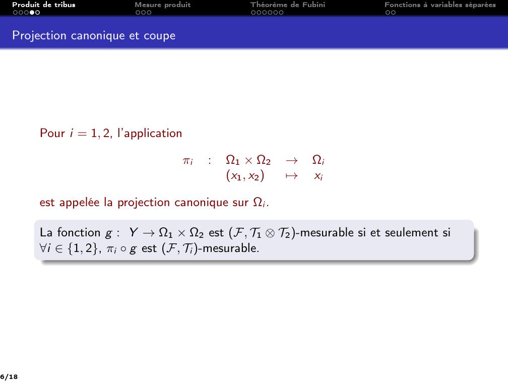 Page 6 : Produit de tribusMesure produitThéorème de FubiniFonctions à variables séparéesProjection canonique et coupePour i = 1, 2, l’applicationπi:Ω1 × Ω2→Ωix1, x27→xiest appelée la projection canonique sur Ωi.La fonction g : Y →Ω1 × Ω2 est F, T1 T2-mesurable si et seulement sii 1, 2, πi ◦g est F, Ti-mesurable.6/18