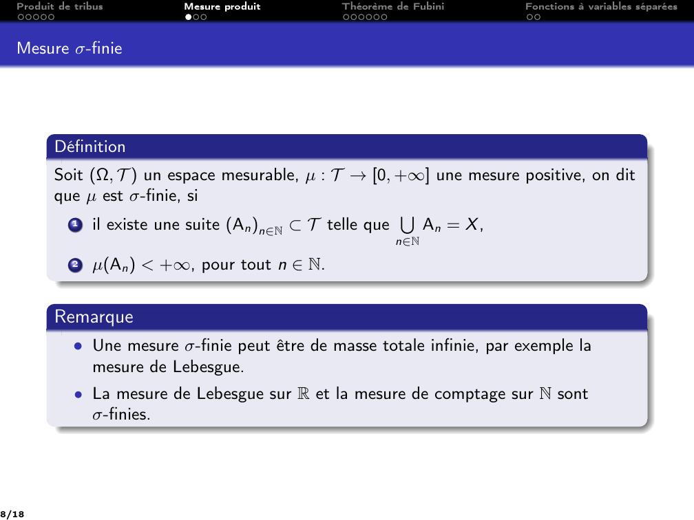Page 8 : Produit de tribusMesure produitThéorème de FubiniFonctions à variables séparéesMesure σ-finieDéfinitionSoit Ω, T un espace mesurable, µ : T →0, + une mesure positive, on ditque µ est σ-finie, si1il existe une suite AnnN T telle que SnNAn = X,2µAn +, pour tout n N.Remarque• Une mesure σ-finie peut être de masse totale infinie, par exemple lamesure de Lebesgue.• La mesure de Lebesgue sur R et la mesure de comptage sur N sontσ-finies.8/18